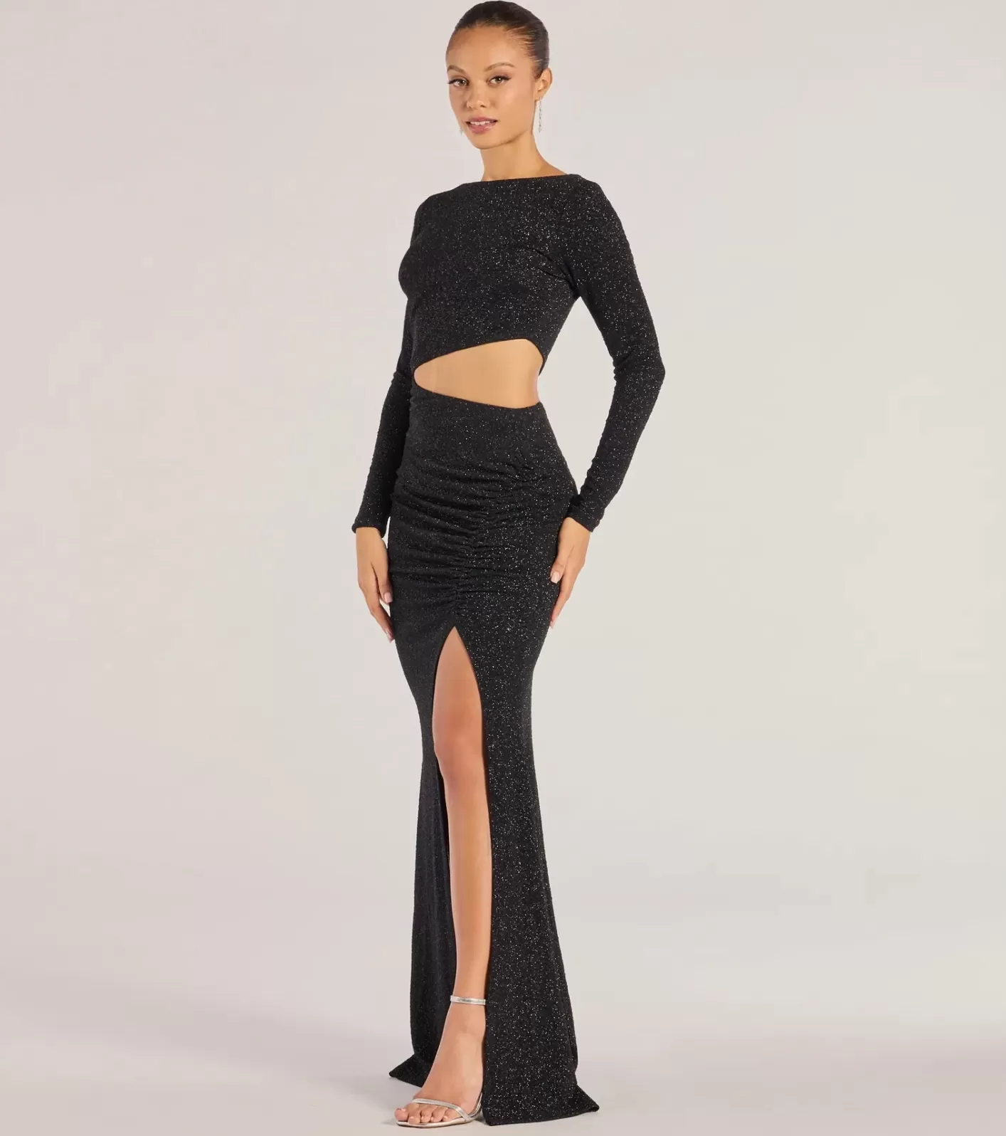 Special OccasionThe long glitter knit dress features a high boat neckline, fitted long sleeves, a bold waist cutout, ruching, a high side slit, and a mermaid silhouette. Complete the formal outfit with a rhinestone clutch.FitFeaturesGlitter knit fabricationBoat necklineFitted long sleevesWaist cutoutRuchingHigh side slitLong hem lengthMermaid silhouetteRuns true to size