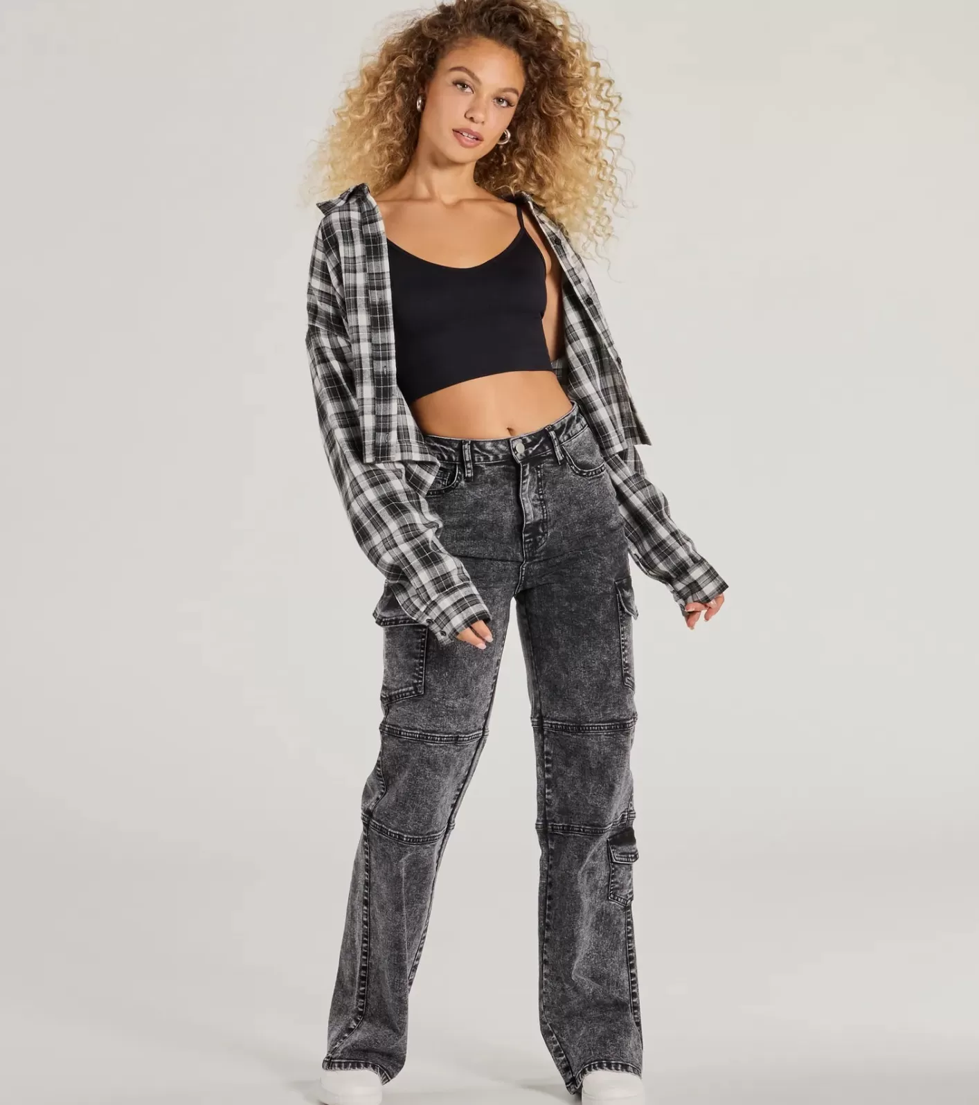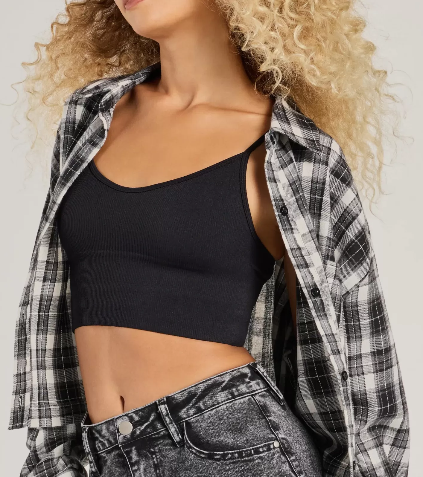 This casual plaid flannel top features a classic collared neckline paired with long sleeves, a complete button-down front, and a single chest pocket. The mid-length relaxed fit makes it perfect for layering over basic crop tops.FitFeaturesPlaid printed cotton-blend woven fabric, non-stretchCollared necklineButton-down frontLong sleeves, dual button detailingChest pocketMid-length hem, relaxed fitRuns true to size