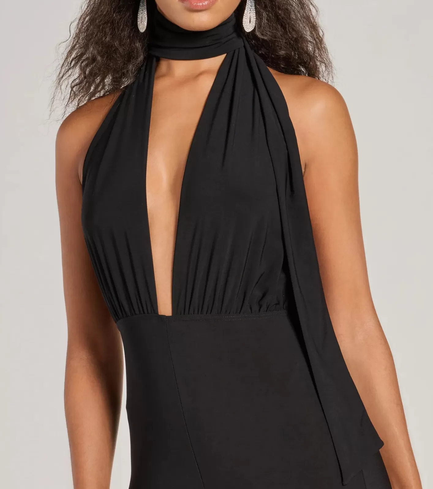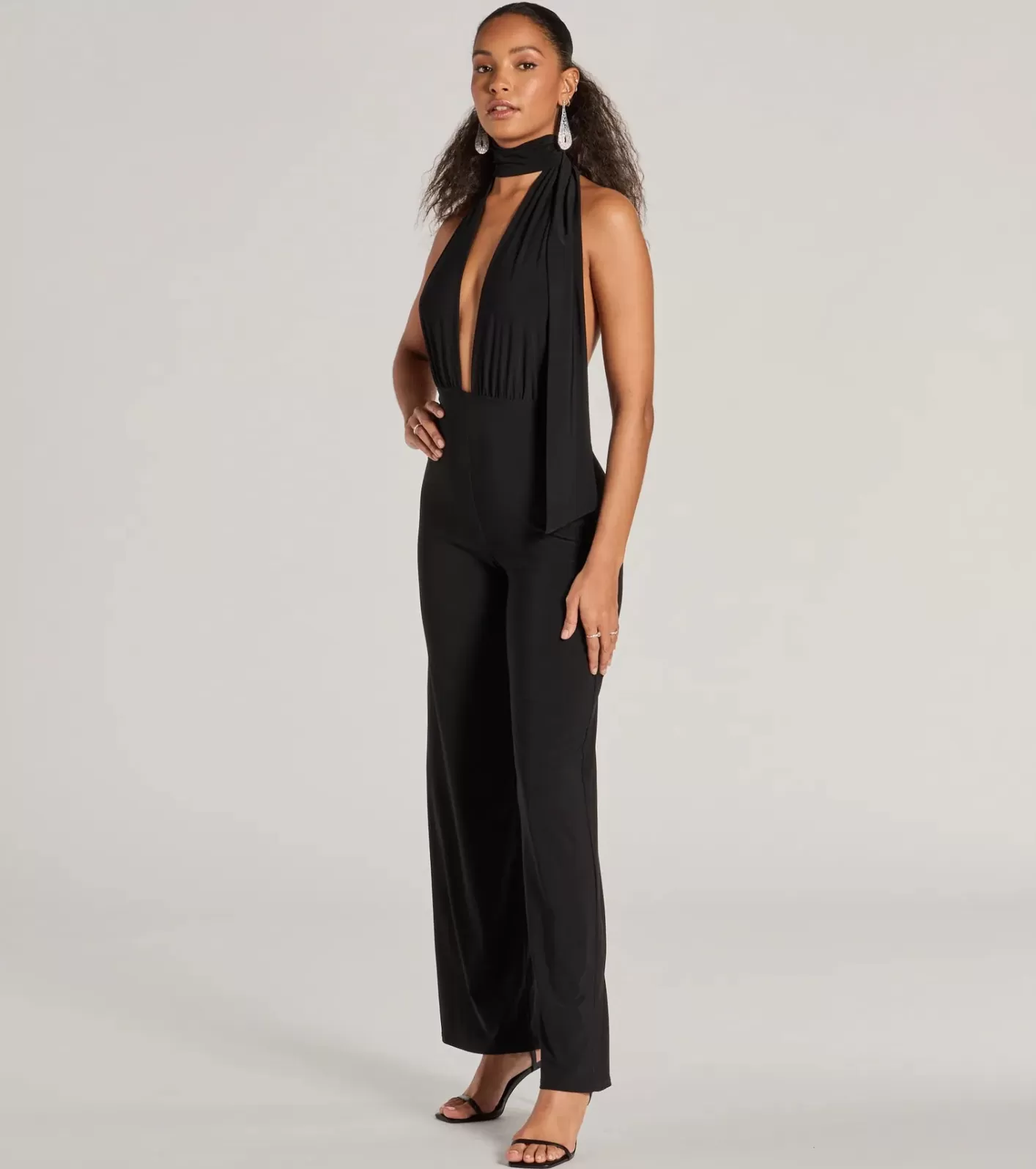 This sleeveless jumpsuit features a stunning plunge halter V-neck with a scarf, an open back, and a flattering straight-leg silhouette. The smooth knit fabric offers stretch and comfort. FitFeaturesSmooth knit fabricPlunge halter V-neckline with scarfOpen backStraight-leg silhouetteJumpsuit has a 13” front rise with a 32” inseam.Runs true to size