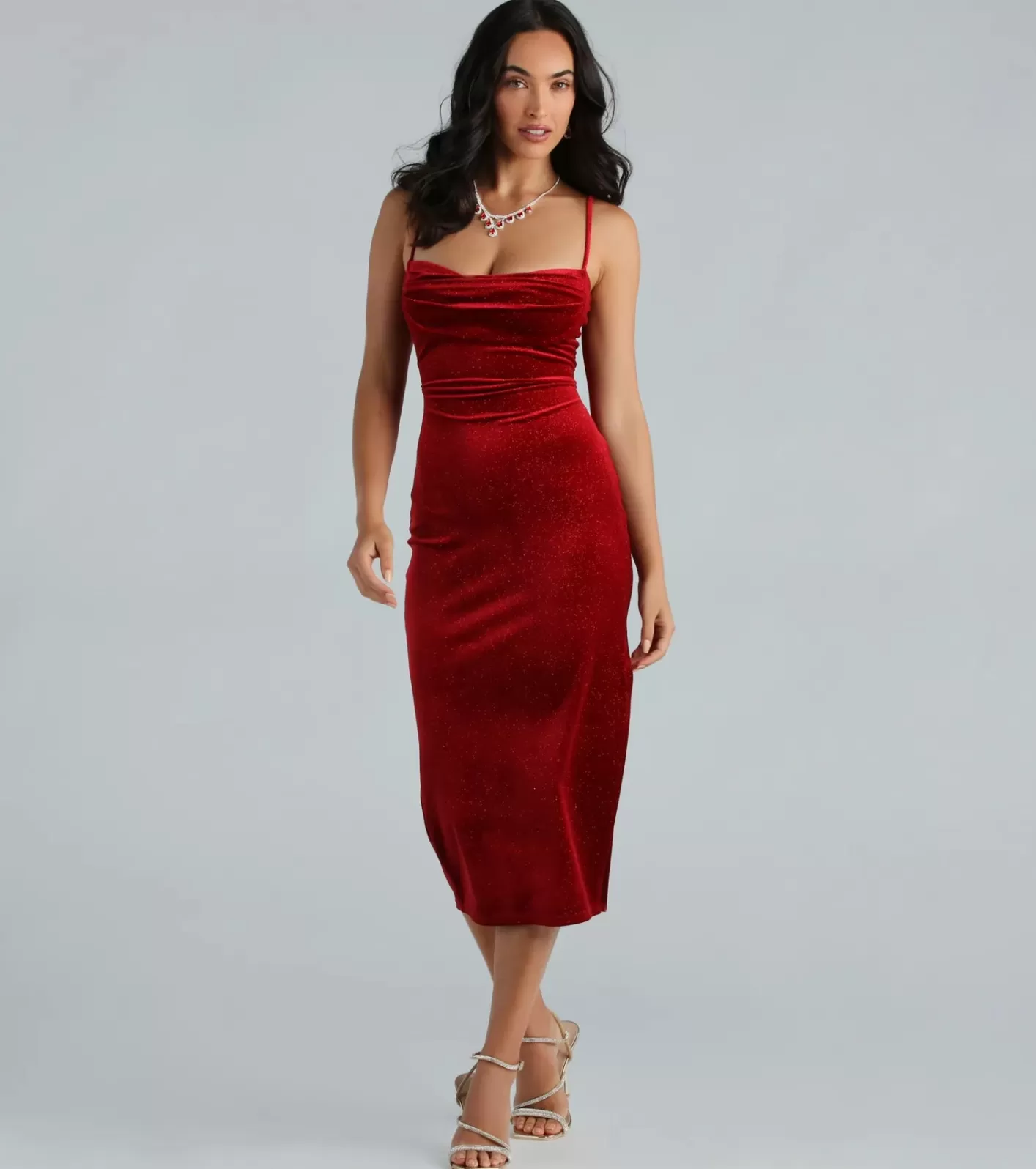 Special OccasionFormal midi dresses are a chic iconic staple for weddings, parties, or dances! The luxe glitter velvet fabric of the Christina formal midi dress elevates this silhouette even more. She features a sleeveless cowl neckline with pleated detailing, spaghetti straps, a midi-length hem with an alluring high-cut side slit to showcase some leg, and a slim-fit silhouette. The glitter velvet fabric includes a bust lining and has a moderate stretch. Style this mid-length dress with a gemstone necklace and earrings set and stiletto heels for a cocktail party.FitFeaturesSleeveless pleated cowl necklineSpaghetti strapsMidi-length hem, high side slitSlim-fit silhouetteGlitter velvet fabric, knit lining at the bust, moderate stretchStrapless or sticky bra recommendedRuns true to size