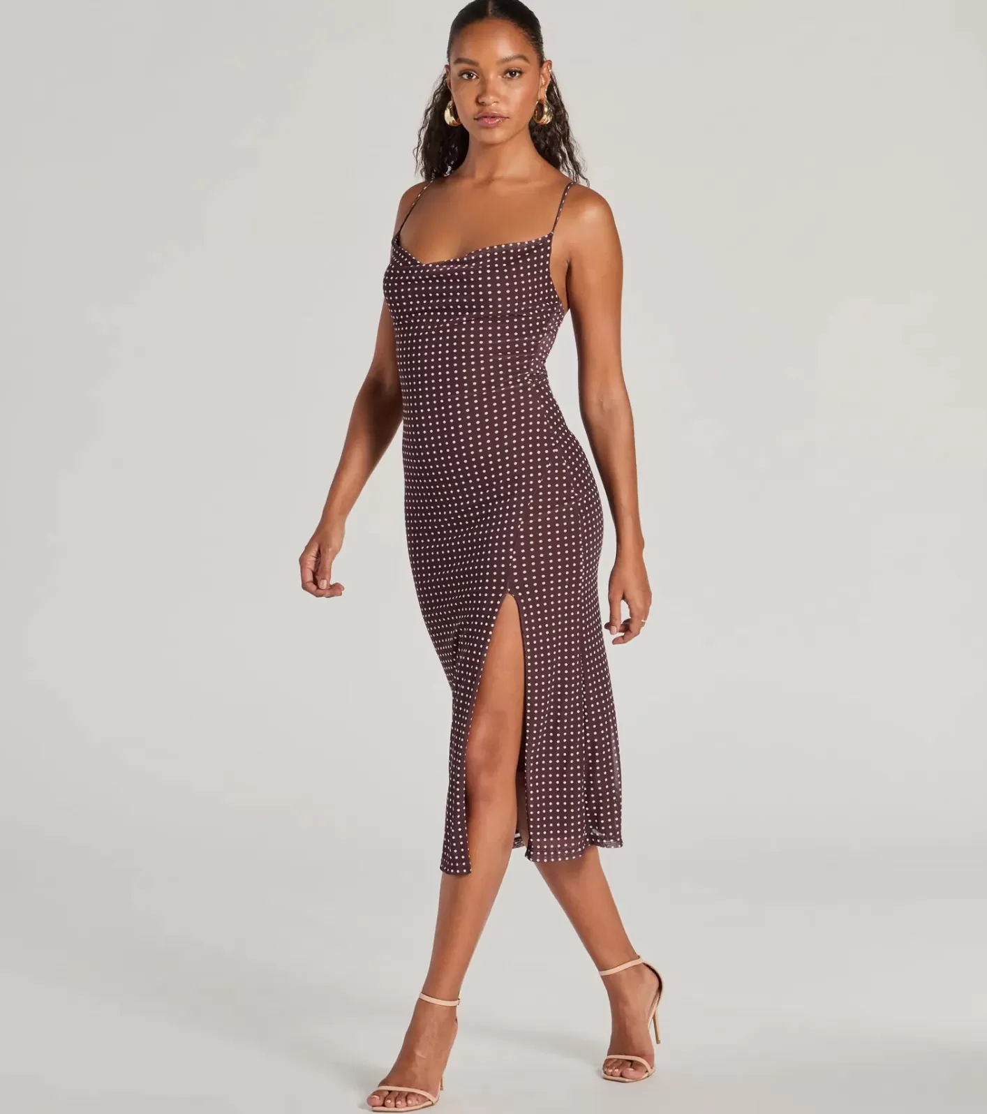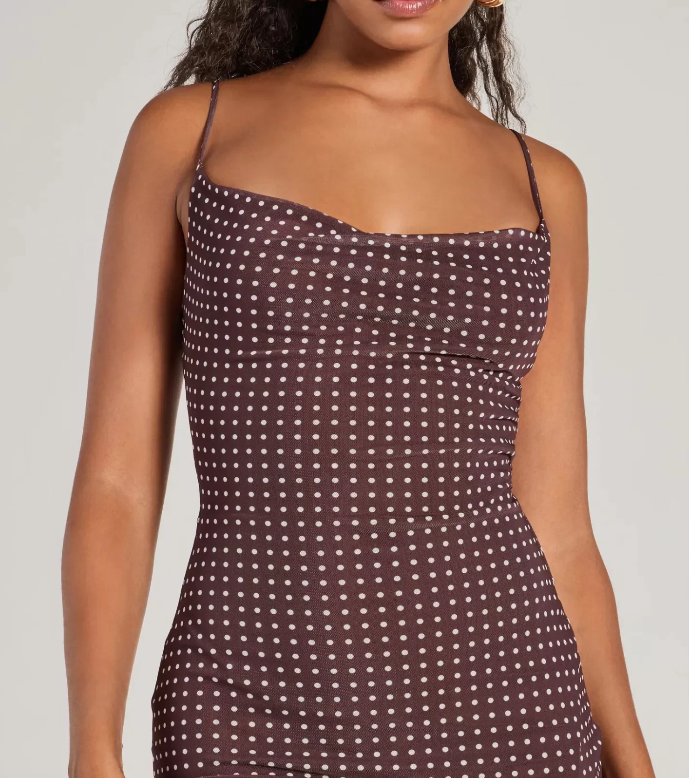 A sleeveless polka dot midi dress features a flattering cowl neckline, spaghetti straps, and a flowy silhouette with a front slit. Perfect for styling with stiletto heels for any occasion.FitFeaturesPolka dot print, mesh fabric lined with stretchy knitSpaghetti strapsCowl necklineFront slitFlowy midi-length silhouetteRuns true to size