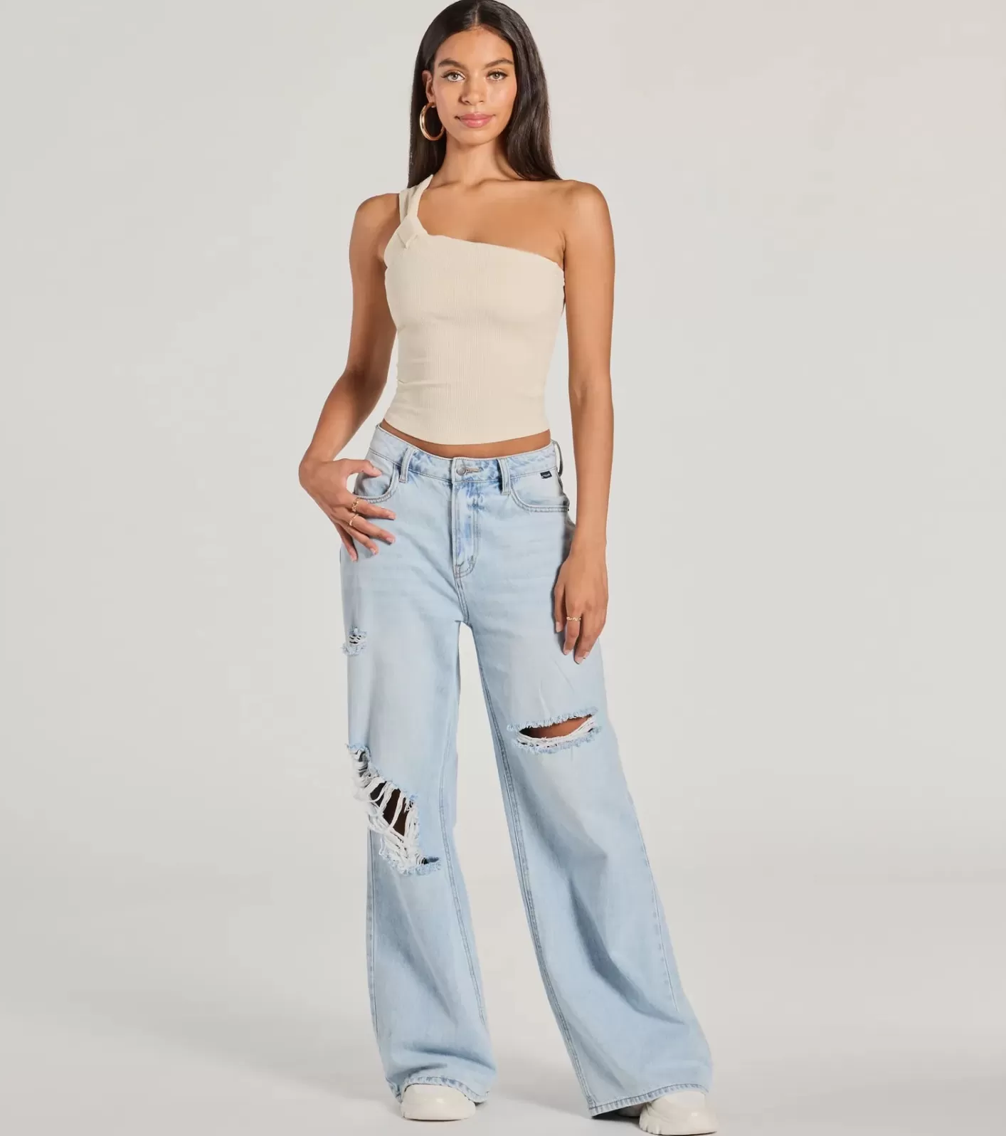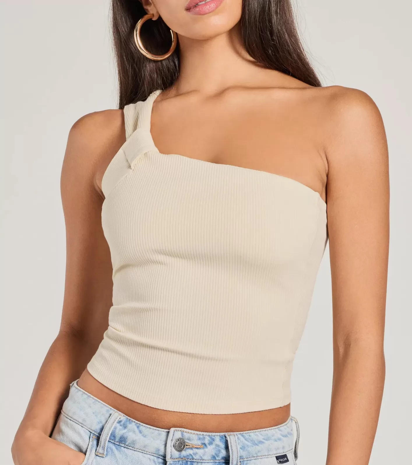 Go ahead and strut your cute and charming self in this sleeveless crop top to elevate your basics collection! It boasts a one-shoulder neckline with a cinch detail, and a fitted crop hem on stretchy rib knit fabric. Complete the look in a denim midi skirt and sandals!FitFeaturesStretchy rib knit fabricOne-shoulder necklineTank strap with cinch detailFitted crop length hemRuns true to size