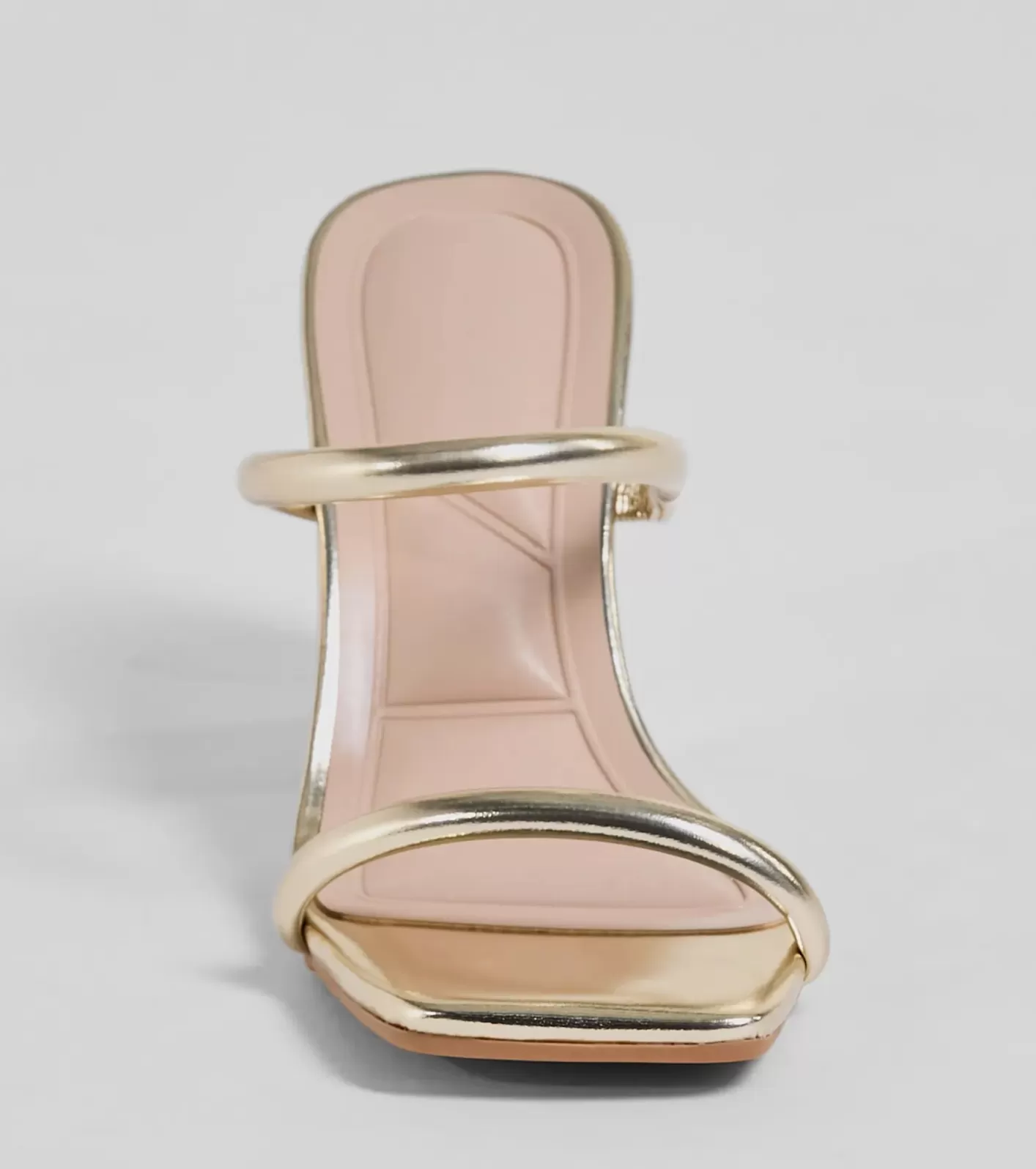 These faux leather heels are essential for taking your look from day to night! They feature a sleek square toe, dual straps, a block heel to elevate the style, and a cushioned footbed for ultimate comfort. Complete the look with a chic hair accessory.FitFeatures3.5" Block HeelSquare toeDual strapsCushioned footbedFaux leather materialSilver and gold are metallicRuns true to size