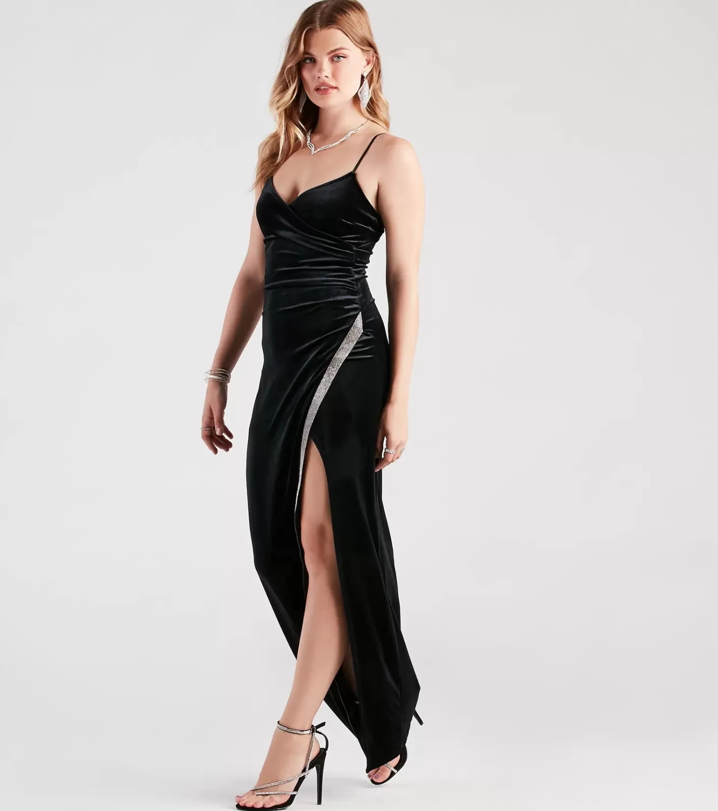 Special OccasionWith glamorous rhinestones, the Dina formal velvet dress shines so brightly at school dances and fancy soirees! She features a sleeveless surplice V-neckline, adjustable spaghetti straps, a side pleated seam, a slim silhouette, and a rhinestone embellished asymmetrical slit that leads to her floor-length hem. The formal dress is crafted from a soft velvet fabric that brings a luxurious allure to your night! Complete the look with fringe earrings and a clutch.FitFeaturesSleeveless surplice V-neckline, adjustable spaghetti strapsSide pleated seam, slim silhouetteRhinestone embellished asymmetrical slitFloor-length hemVelvet fabric, bust lining, moderate stretchStrapless bra or sticky bra recommendedRuns true to size