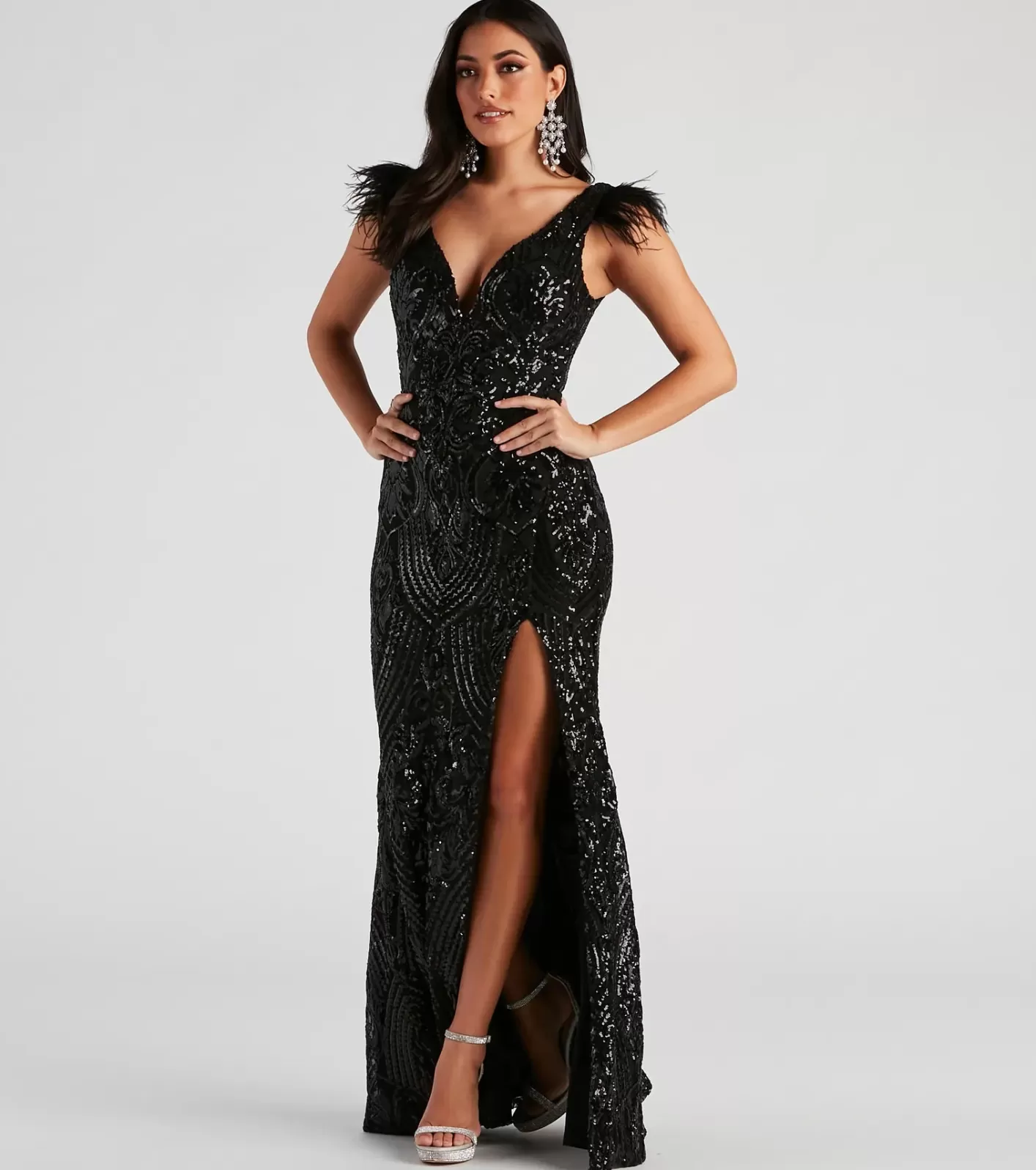 Special OccasionCare to be daring in the Elle formal dress? Go for this show-stopping sequin embellished dress to glow at every holiday party or event! She features a sleeveless plunge V-neckline with a wire insert for a structured fit, feather-trim shoulder straps, and a lightly padded bust. Her form-hugging mermaid silhouette accentuates your curves along her floor-length hem with a sexy high-cut front slit to flaunt some skin. The formal dress is composed of a sequin scroll patterned mesh fabric with a knit lining and minimal stretch. Complete your statement look in a glamorous hair accessory and clutch.FitFeaturesSleeveless plunge V-neckline, wire insertLightly padded bust, bra optionalBack zipper closureFeather trim shoulder strapsHigh-cut front slit, mermaid silhouette, floor-length hemSequin scroll pattern mesh, knit lining, minimal stretchRuns true to size