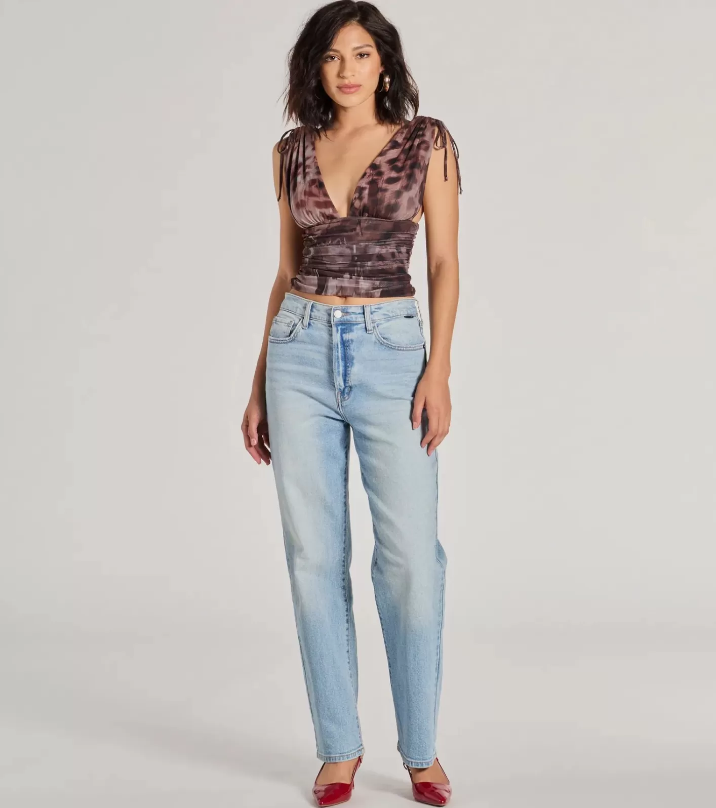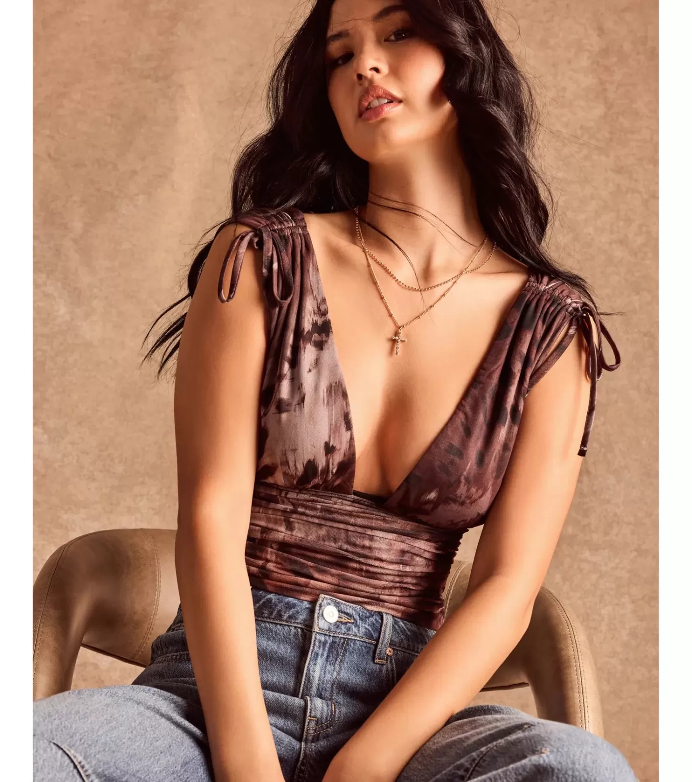 FitFeaturesSheer mesh fabric with knit lining, plenty of stretchAbstract animal printPlunging V-necklineTank shoulder straps, dual drawstring accents at the shoulderRuched side seamsFitted mid-length hemRuns true to size