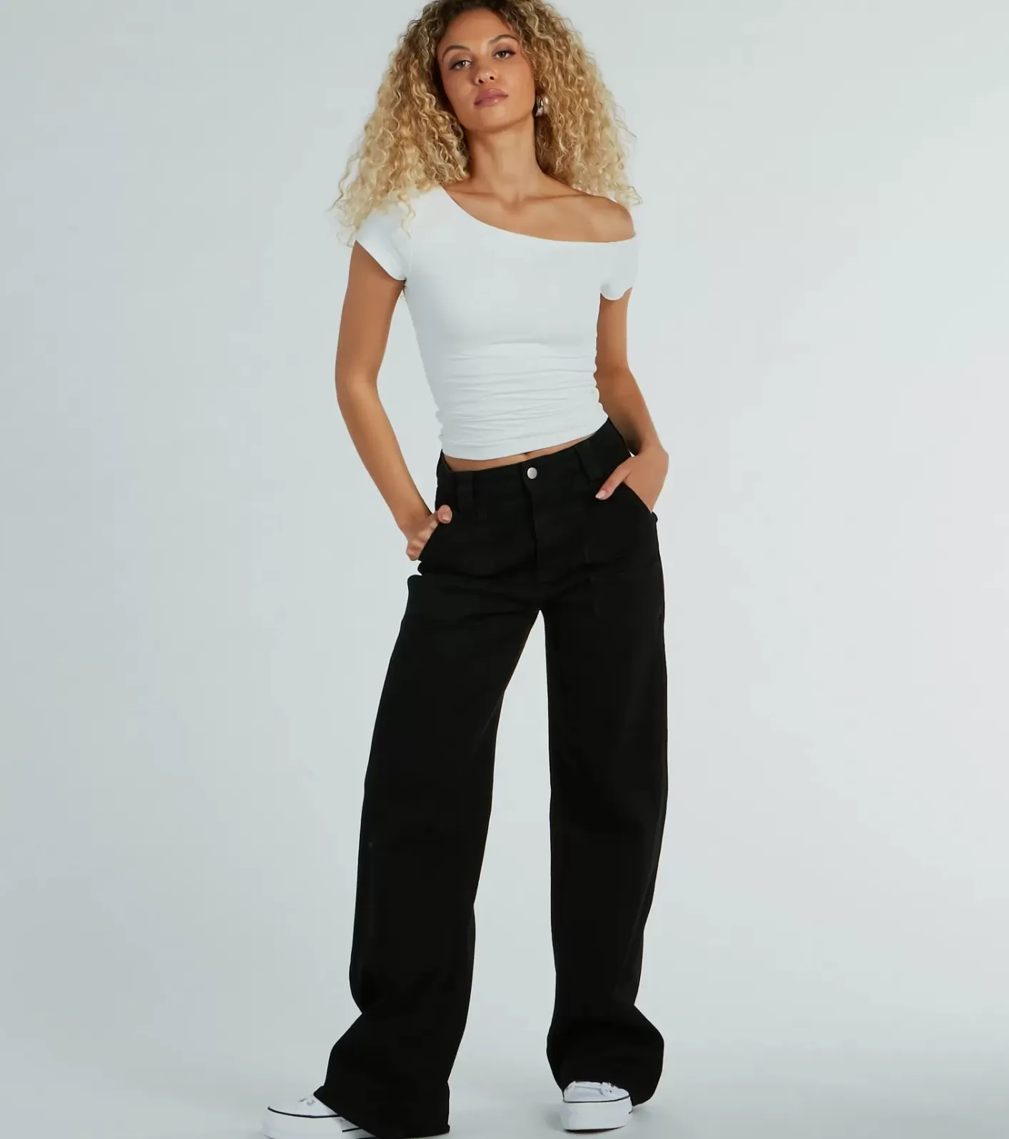 This simple yet chic short sleeve top will be a new fave style of yours! Made with a soft stretchy knit fabric, it features an asymmetric off-the-shoulder design with a chic boat neckline to showcase some skin, short sleeves, a mid-length hem, and a form-hugging fit. Style with cargo pants and sneakers for a casual dinner.FitFeaturesStretchy brushed knit fabricAsymmetric off-the-shoulder boat necklineShort sleevesMid-length hemForm-hugging fitRuns true to size
