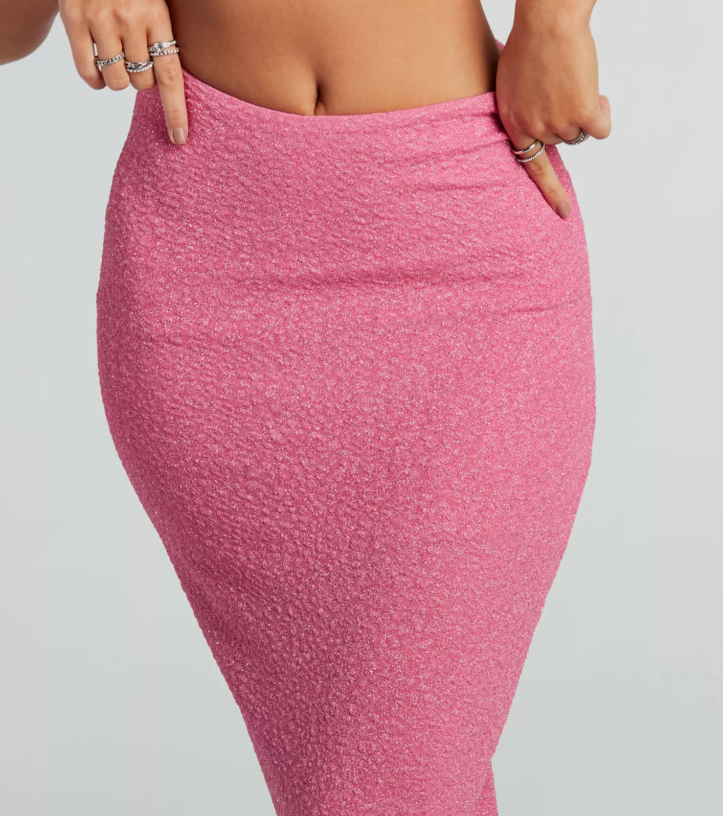 Bring on the glittery vibes for your next girl's night in this high slit maxi skirt! Designed with a glitzy glitter knit fabric that has a mini-length lining, this long skirt is glam perfection. It features a high waist, a hip-hugging fit to flaunt your figure, a maxi-length hem with a high-cut back slit for an alluring detail, and an overall form-fitting silhouette for a sultry slay. Complete your going-out look with the matching crop top and clear heels!Shop Matching Top: Glittery Vibes Ruched Spaghetti Strap Crop TopFitFeaturesTextured glitter knit fabric with mini-length knit liningPlenty of stretchHigh waistMaxi-length hemBack slitForm-hugging fitRuns true to size