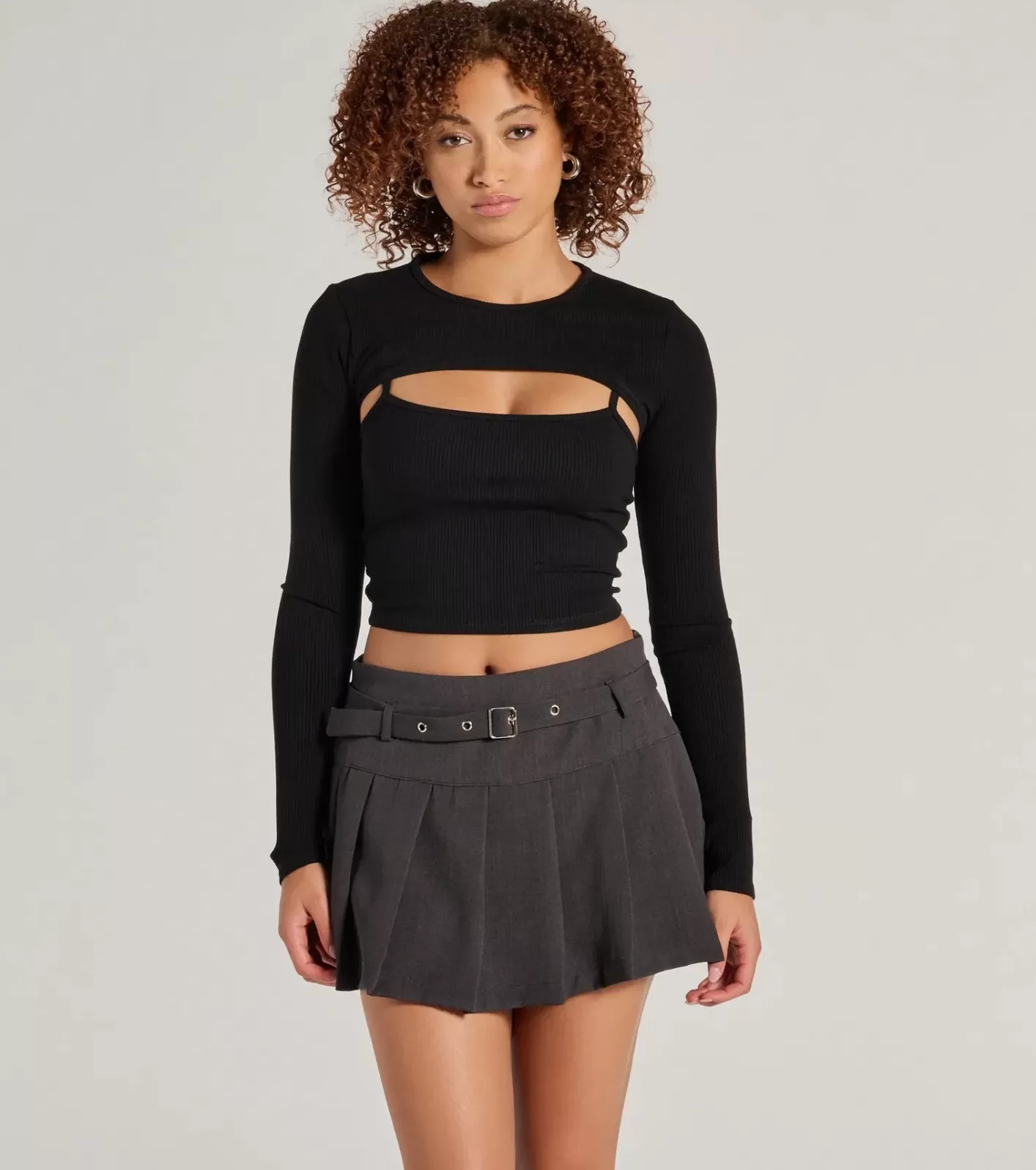 Show off an it-girl attitude in this woven skort featuring a high-rise fit with a chic belt, a trendy drop waist design, and a mini-length pleated A-line overlay with fitted shorts for coverage. Pair with a cropped cardigan and sneakers!FitFeaturesHeathered woven fabric, minimal stretchHigh-rise fit with beltSide zipper with hook-eye closureDrop waist designMini-length pleated A-line overlay, fitted shortsSkort in size small has a 7" front rise with a 1.5" inseamRuns true to size
