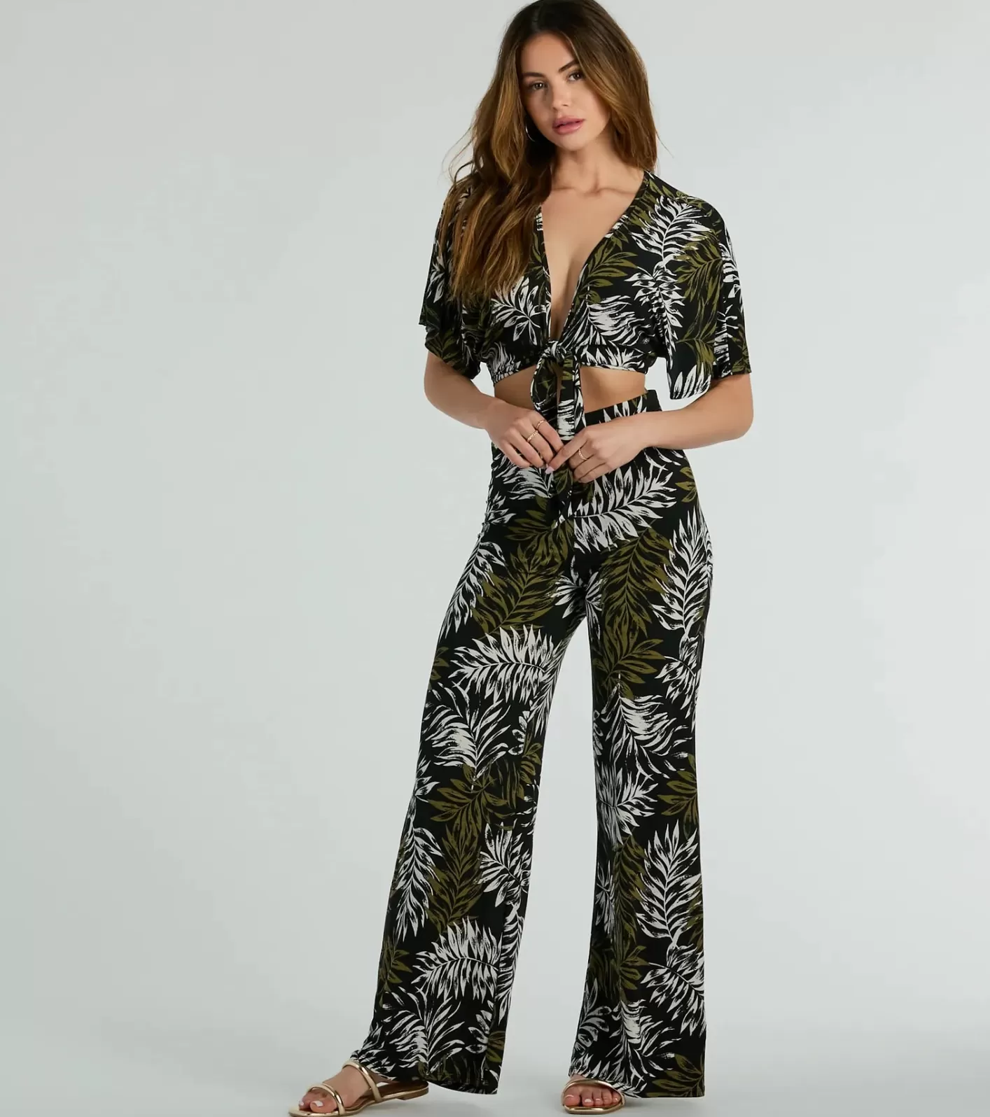 Escape to a tropical island in this breezy palm print crop top perfect for dinners with a view or exploring with a cocktail in hand! This top has flirty dolman short sleeves and a tie-front design along the cropped hem on stretchy knit palm print fabric. Complete the look with the matching pants.Shop Matching Bottoms: Living In The Palms Wide Leg Palazzo PantsFitFeaturesPalm print, stretchy knit fabricDolman short sleevesTie-front Cropped hemRuns true to size