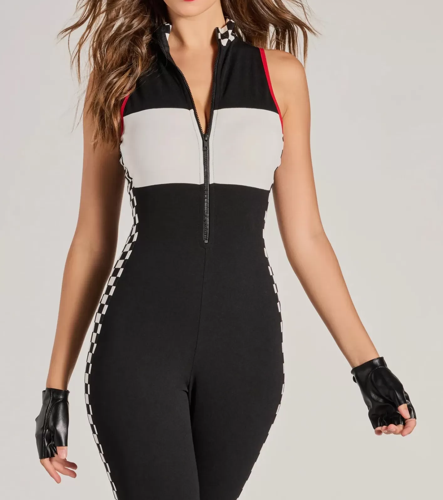 Show off your need for speed this Halloween in a jumpsuit that features a mock neck with a plunging zippered V-neckline, checkered print panels from bodice to hem, and a skinny leg fit. Complete your costume with matching faux leather gloves and stiletto heels!FitFeaturesCrepe fabric, plenty of stretchSleeveless mock neck, plunging zippered V-necklineCheckered print panels Skinny-leg fitJumpsuit in size small is 57" shoulder to hem with a 12" front rise and a 30" inseamRuns true to size