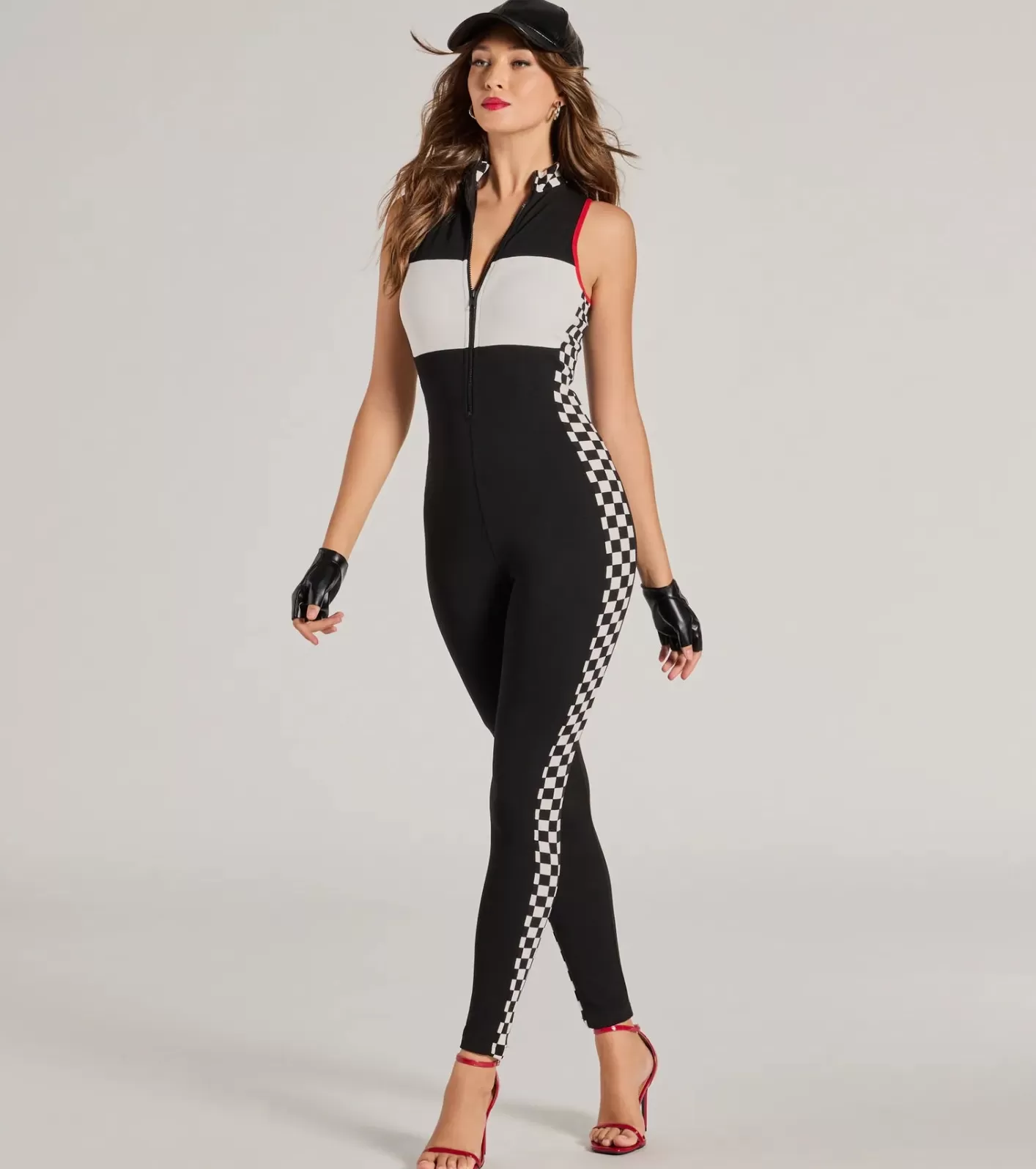 Show off your need for speed this Halloween in a jumpsuit that features a mock neck with a plunging zippered V-neckline,…