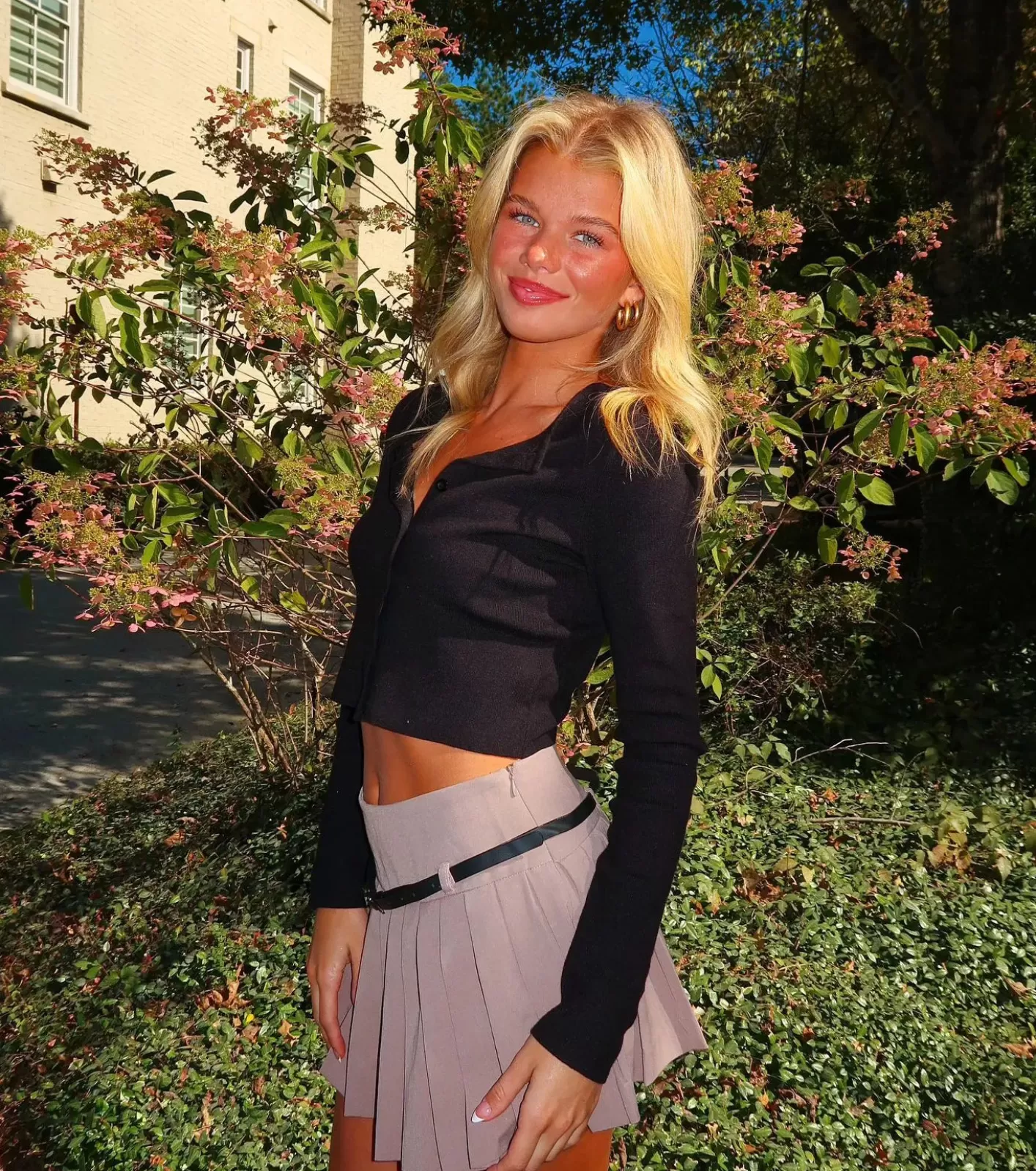 Channel a preppy vibe with a pleated skort that brings the flair! The skort features a belted drop waist and a mink skirt overlay with hidden shorts. Complete outfit with a cropped cardigan and boots! FitFeaturesWoven knit fabricationDrop waistBelted waist accent with loopsPleatsMini skirt overlay with hidden shortsRuns true to size