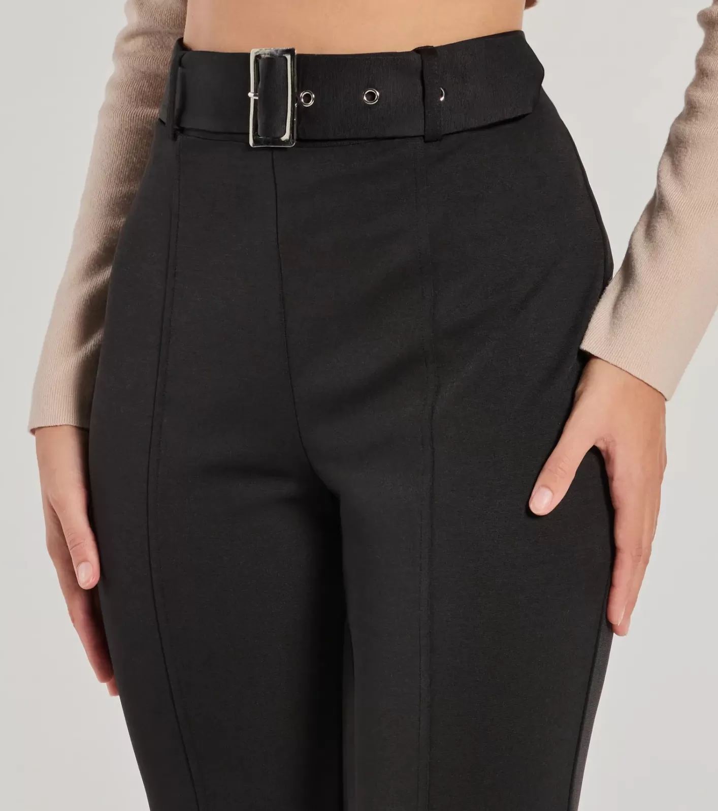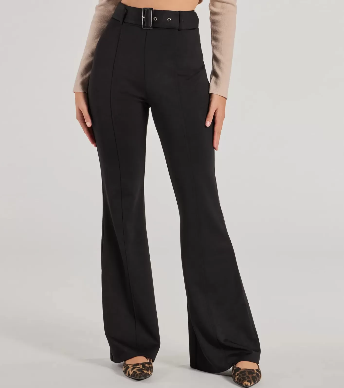 FitFeaturesKnit fabricationHigh-rise waistBelted waist with metal grommetsFront vertical seamsStraight-legFlared wide-leg hemRuns true to size