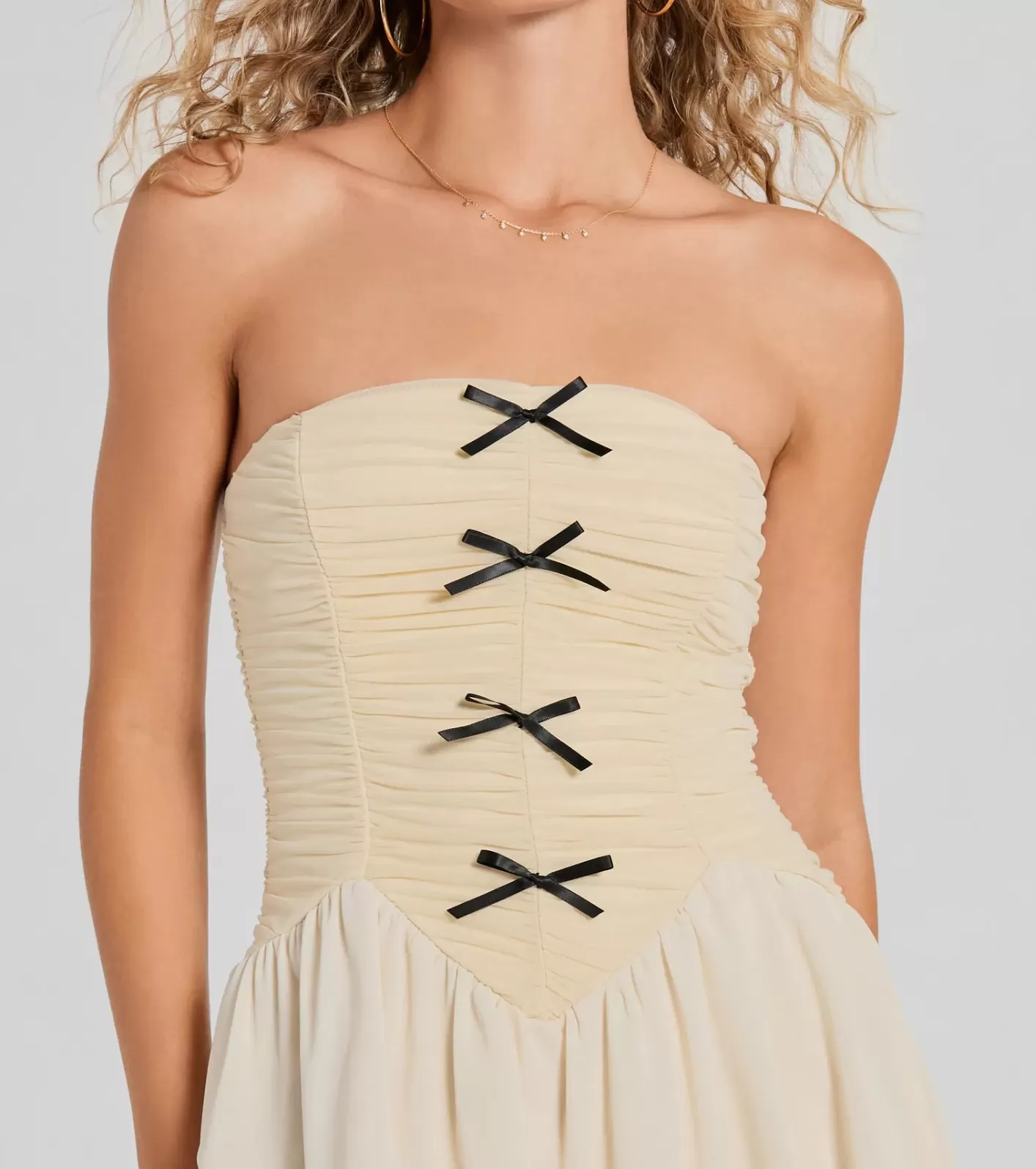 This strapless mini dress is the prettiest pick for this season's soirees! The strapless neckline, front bow details…