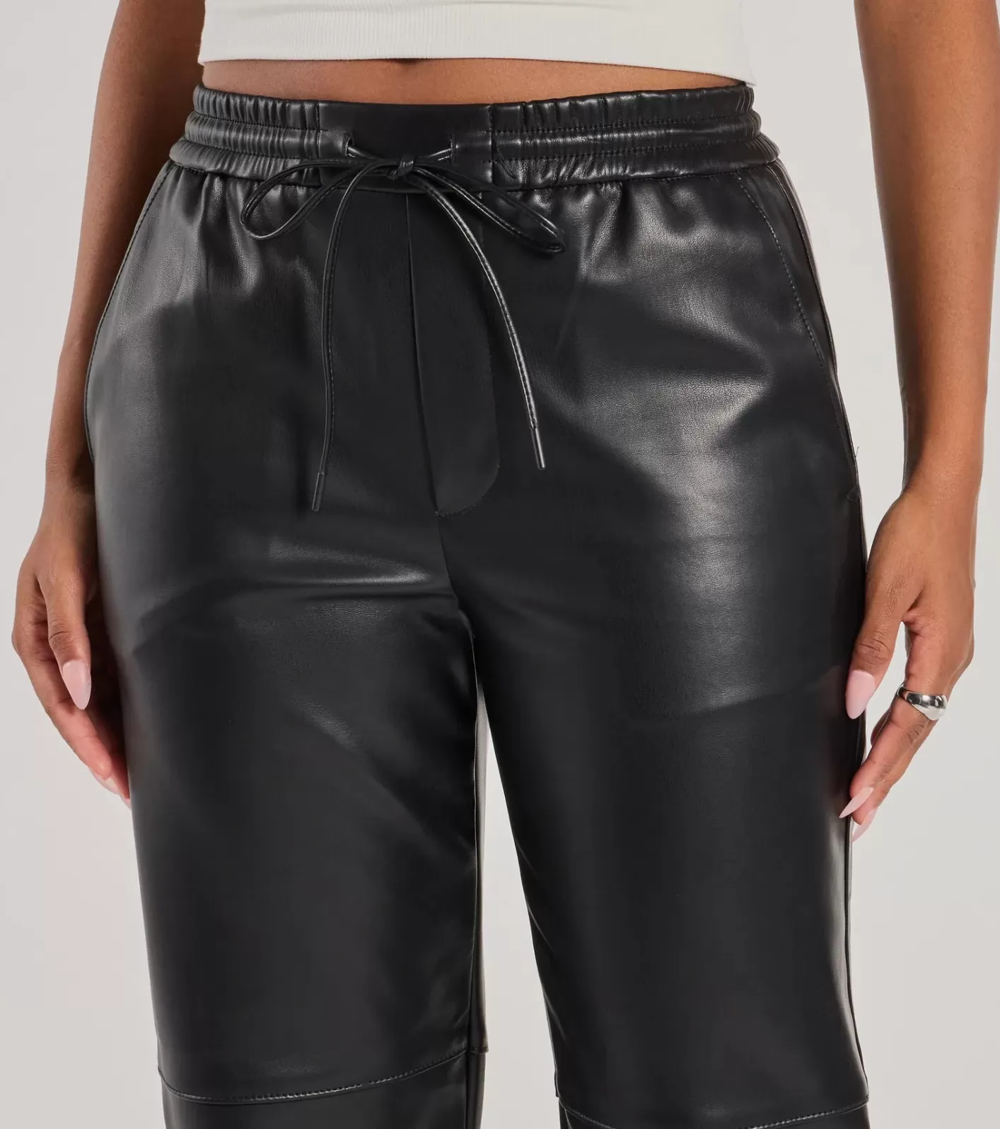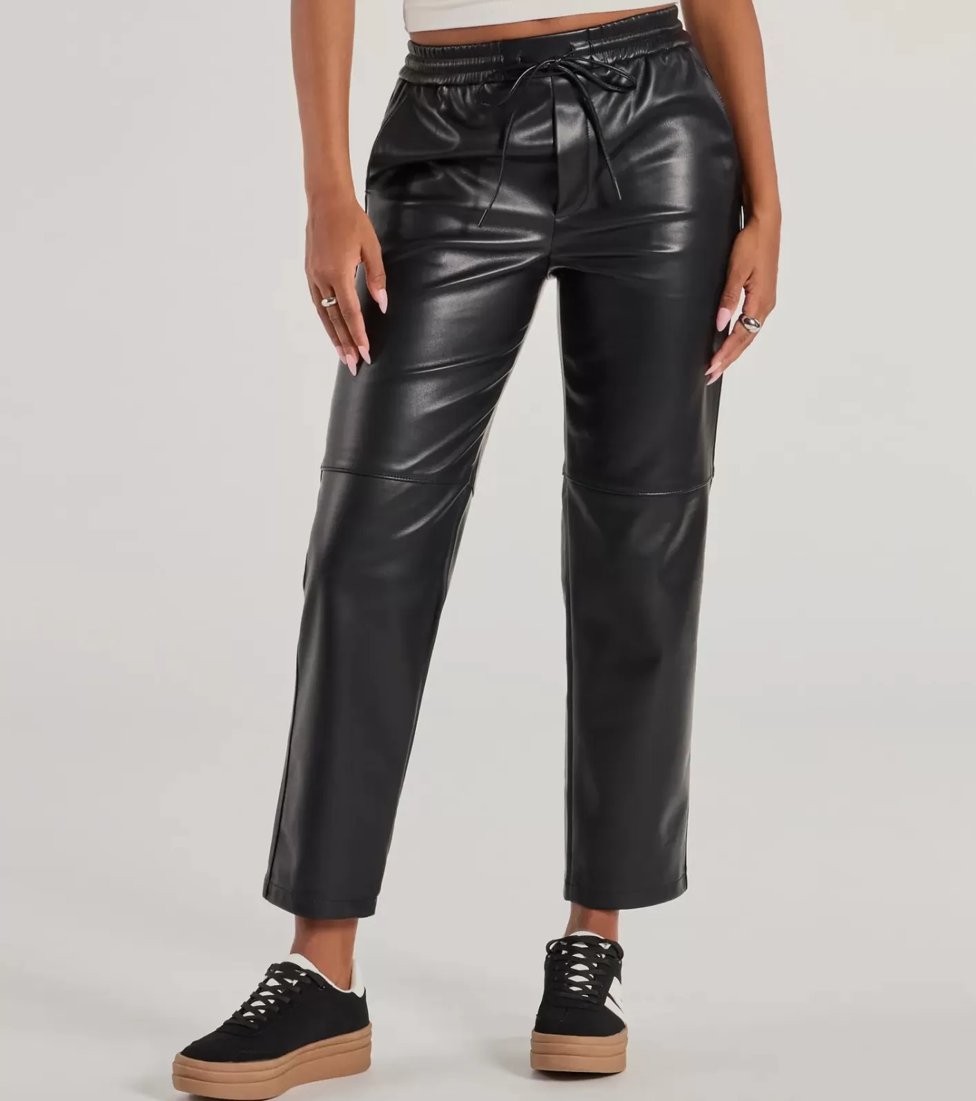 FitFeaturesFaux leather fabricationElastic drawstring waistSlant pocketsFaux back pocketsCapri-length hemRuns true to size