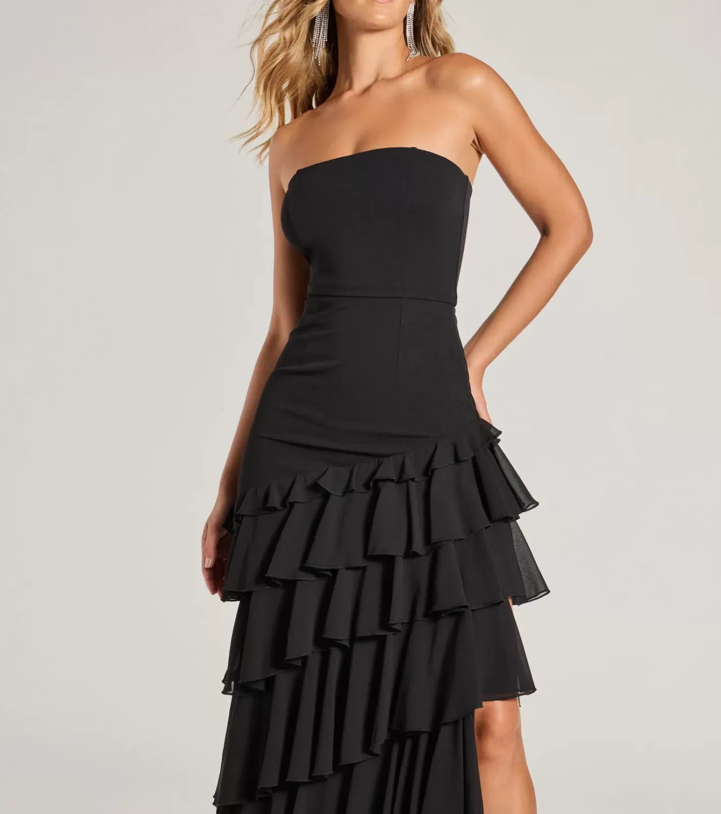 Special OccasionSweep everyone off their feet in the Shianna strapless formal dress at weddings, banquets, or galas! She features a strapless crepe neckline, chiffon ruffled A-line silhouette and flattering floor-length hem. You'll feel like a true work of art as you effortlessly glide through any formal occasion in this stunning dress! Complete the look with earrings, a clutch, and strappy block heels.FitFeaturesCrepe fabric lined with stretchy knitStrapless necklineBack zipper and hook-eye closureChiffon ruffled A-Line silhouetteSticky bra or pasties recommendedRuns true to size