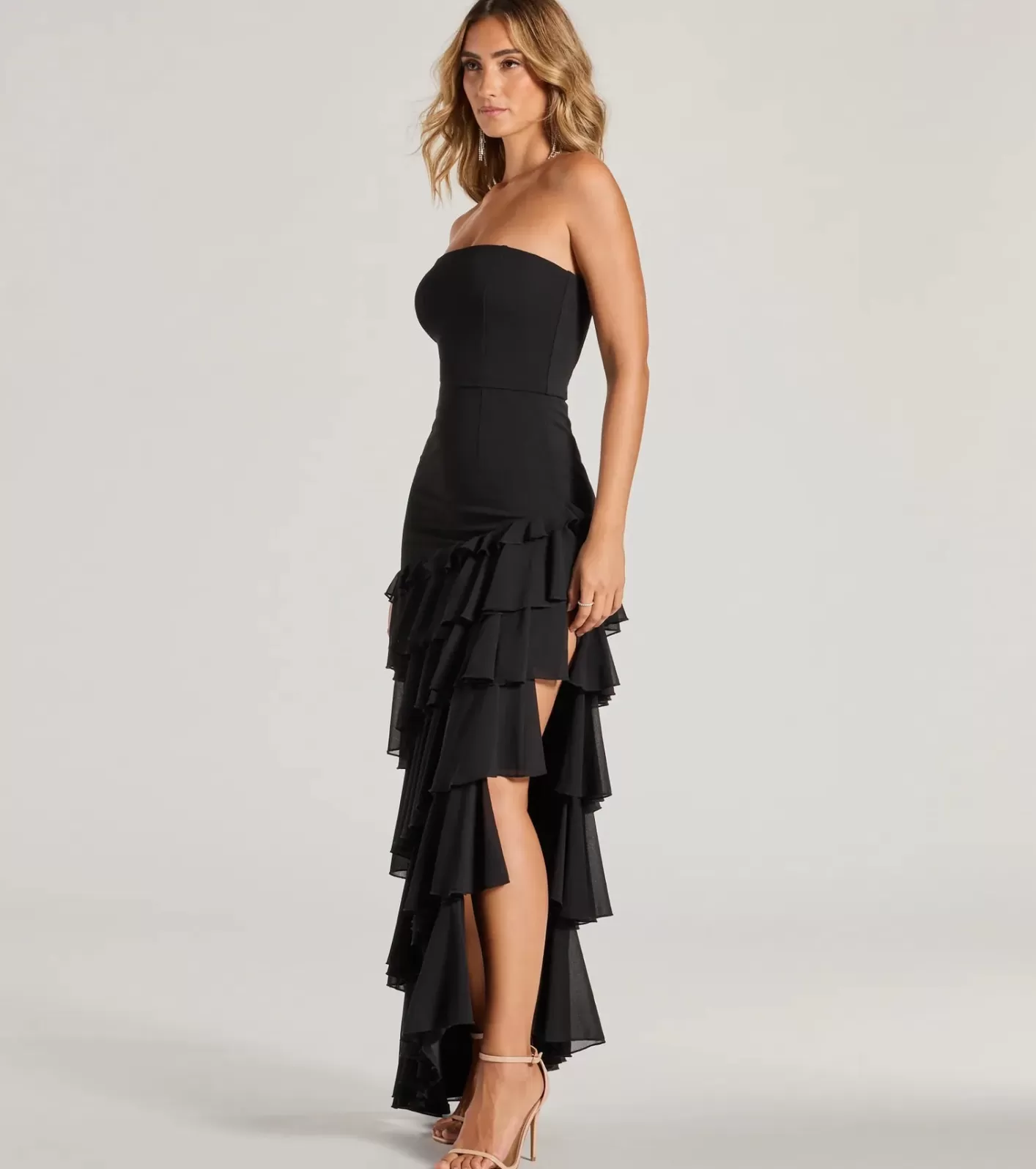 Windsor Shianne Strapless Chiffon Ruffled A-Line Formal Dress BLACK Fashion