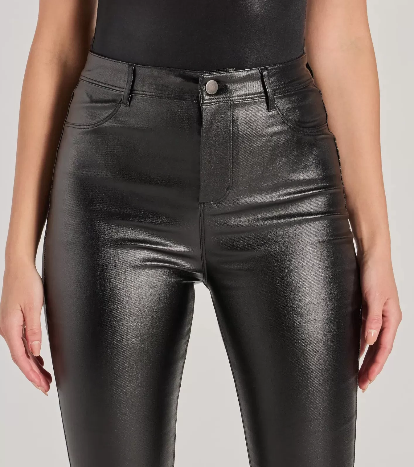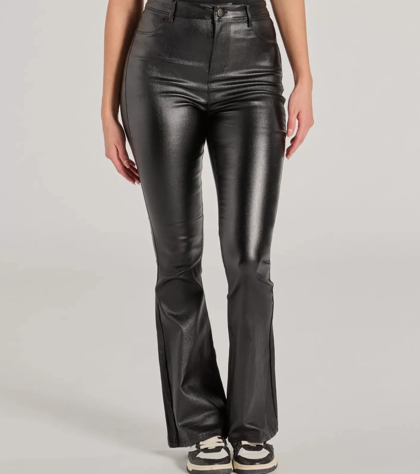 These faux leather pants feature a flattering high-rise waist, hip-hugging fit, and a trendy flare hem on coated fabric for a sleek look. Perfect for styling with a graphic tee and booties.FitFeaturesCoated faux leather fabric, slight stretchHigh-rise waistHip-hugging fit, flare hemFront button and hidden zipper closureTwo-pocket stylingPants have an 11" front rise with a 30.5" inseamRuns true to size