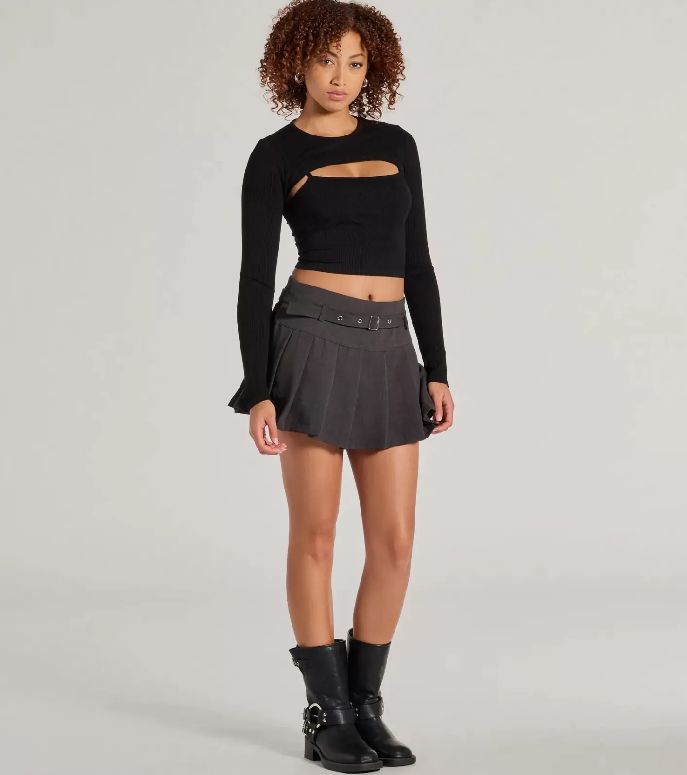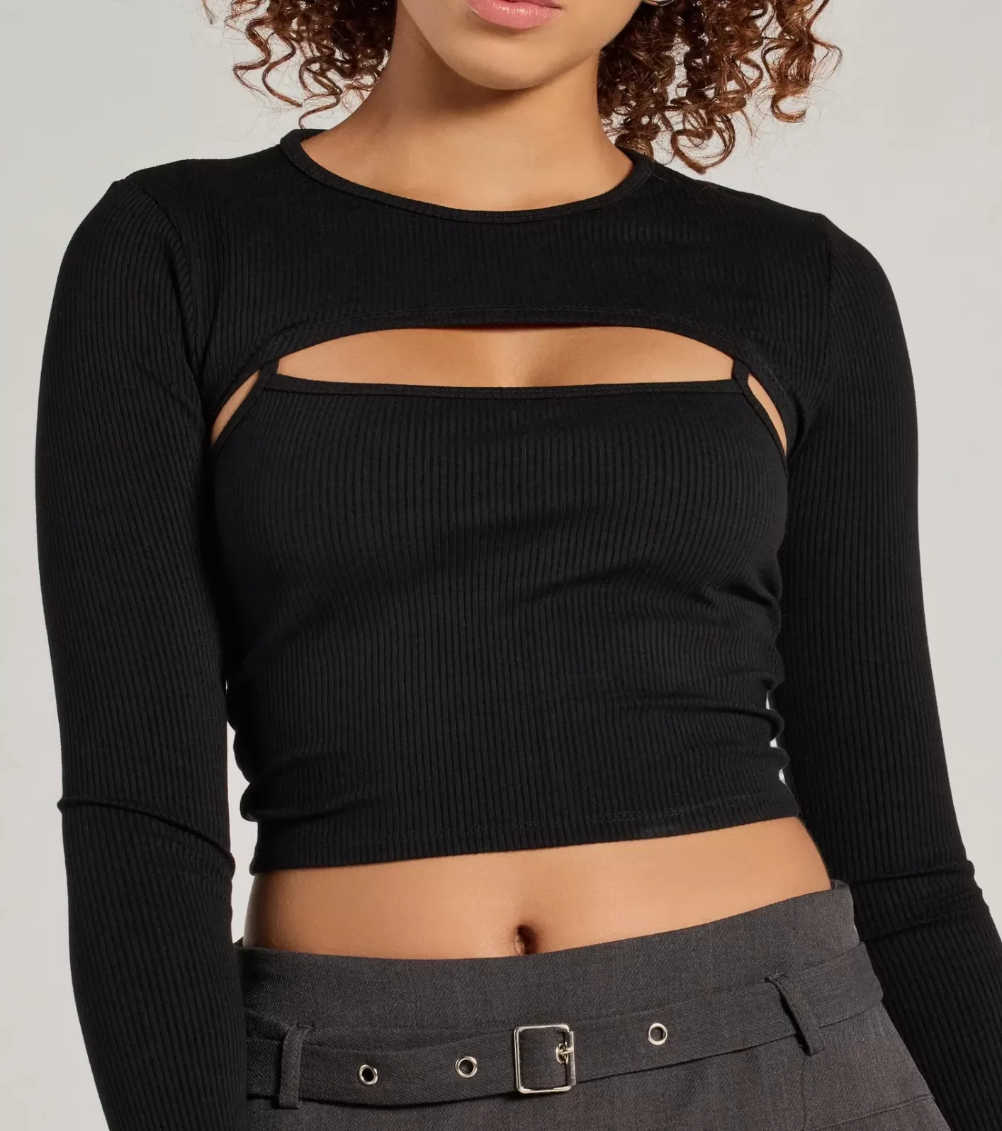 Snuggle up in a knit top for a chic layered look! The cropped top features a crew neckline, long fitted sleeves, spaghetti straps, front and back cutouts, and a form-hugging fit. Complete with a plaid mini skirt for a preppy vibe.FitFeaturesStretchy ribbed knit fabricCrew necklineSpaghetti straps, front and back cutoutsLong fitted sleevesCropped hemForm-hugging fitRuns true to size