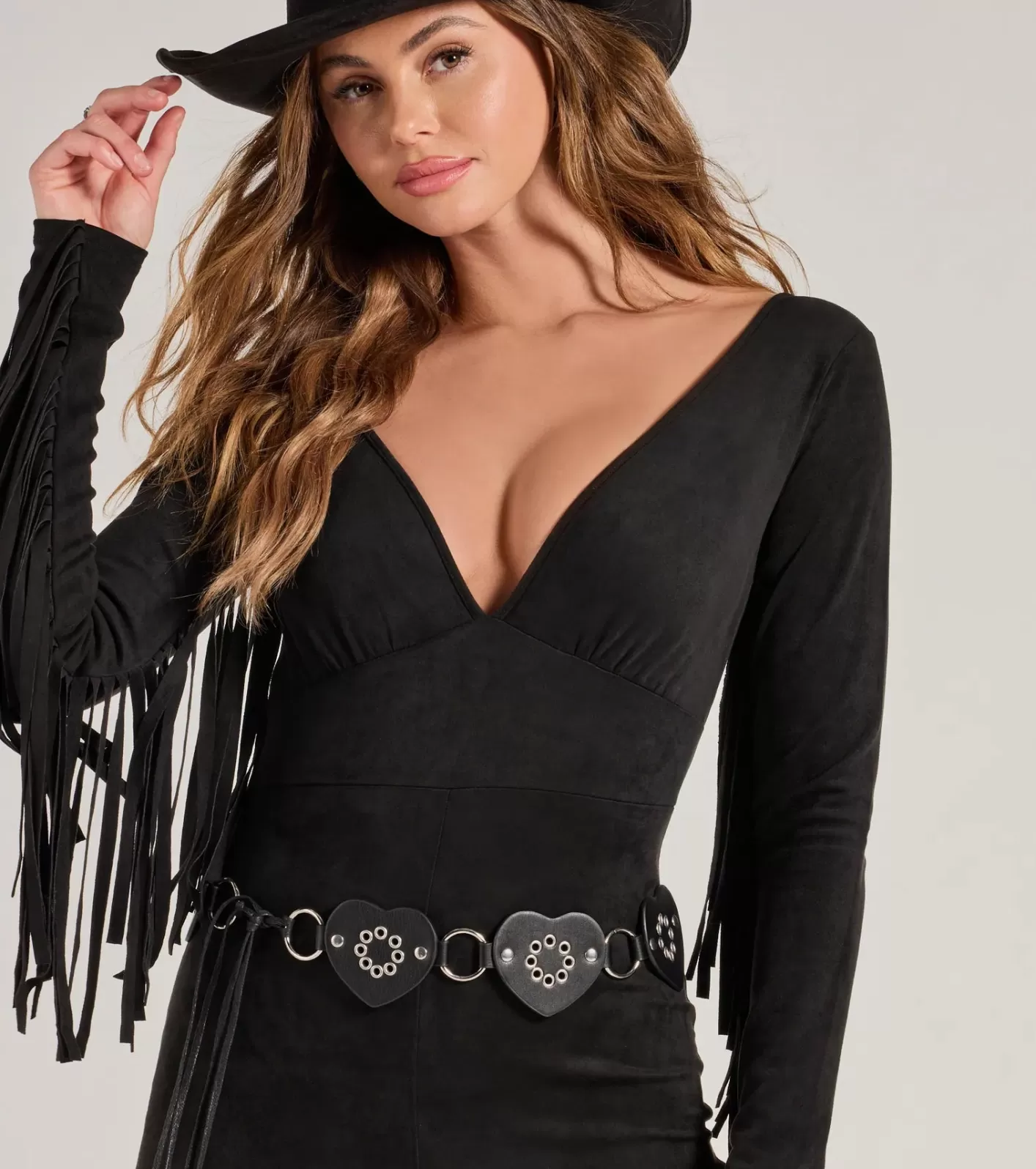 Feel the love with the sweetest belt in the West! The faux leather belt features a heart-shaped medallion design with mini metal o-rings and a lobster clasp closure. Complete look with a fringe romper! FitFeaturesFaux leather material Heart-shaped medallion design Mini metal o-ringsLobster clasp closure