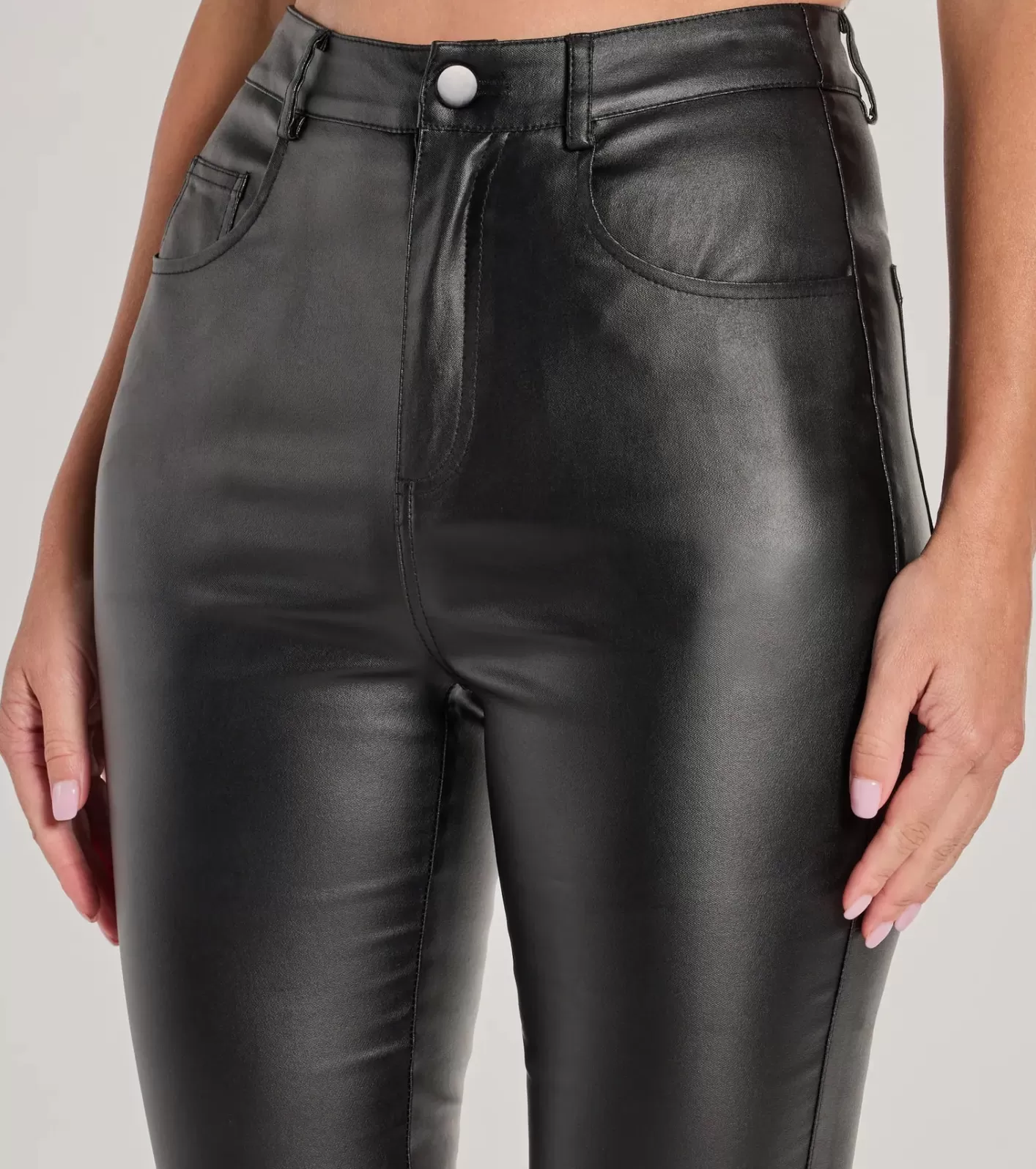 FitFeaturesCoated faux leather fabricationHigh-rise waistSingle button with zipper closureFive-pocket with belt loop des…