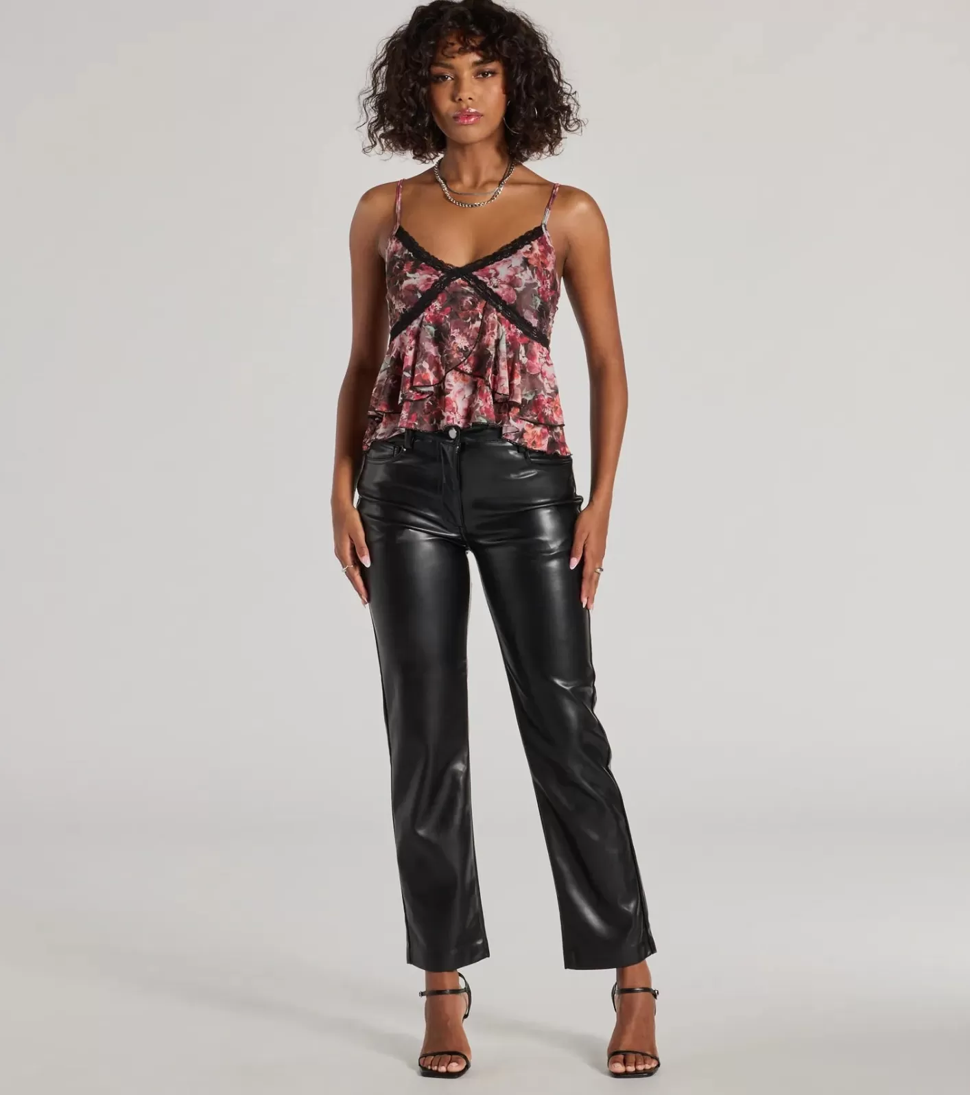 FitFeaturesSheer mesh fabric with top knit lining, plenty of stretchAbstract floral printSleeveless V-neckline, sheer lace trimSpaghetti strapsTiered ruffled cropped hemRuns true to size