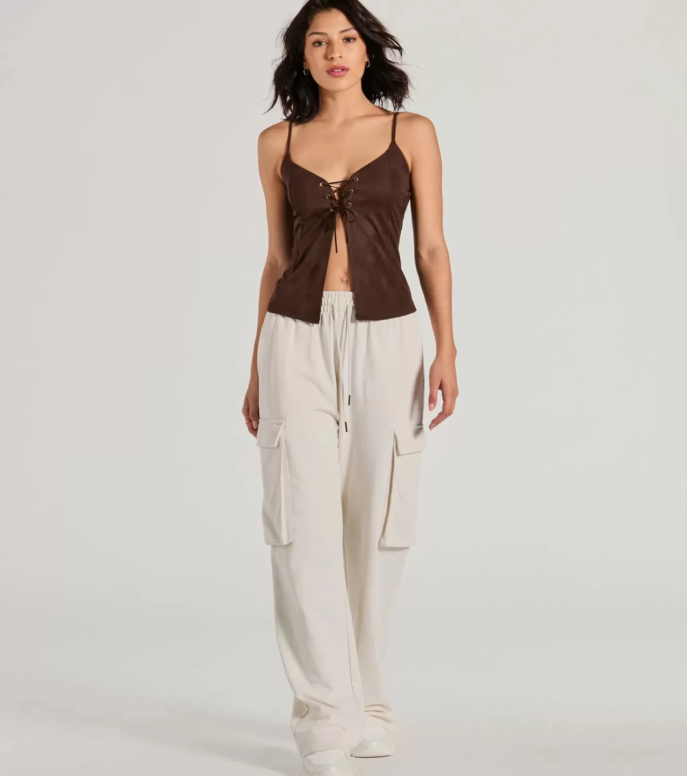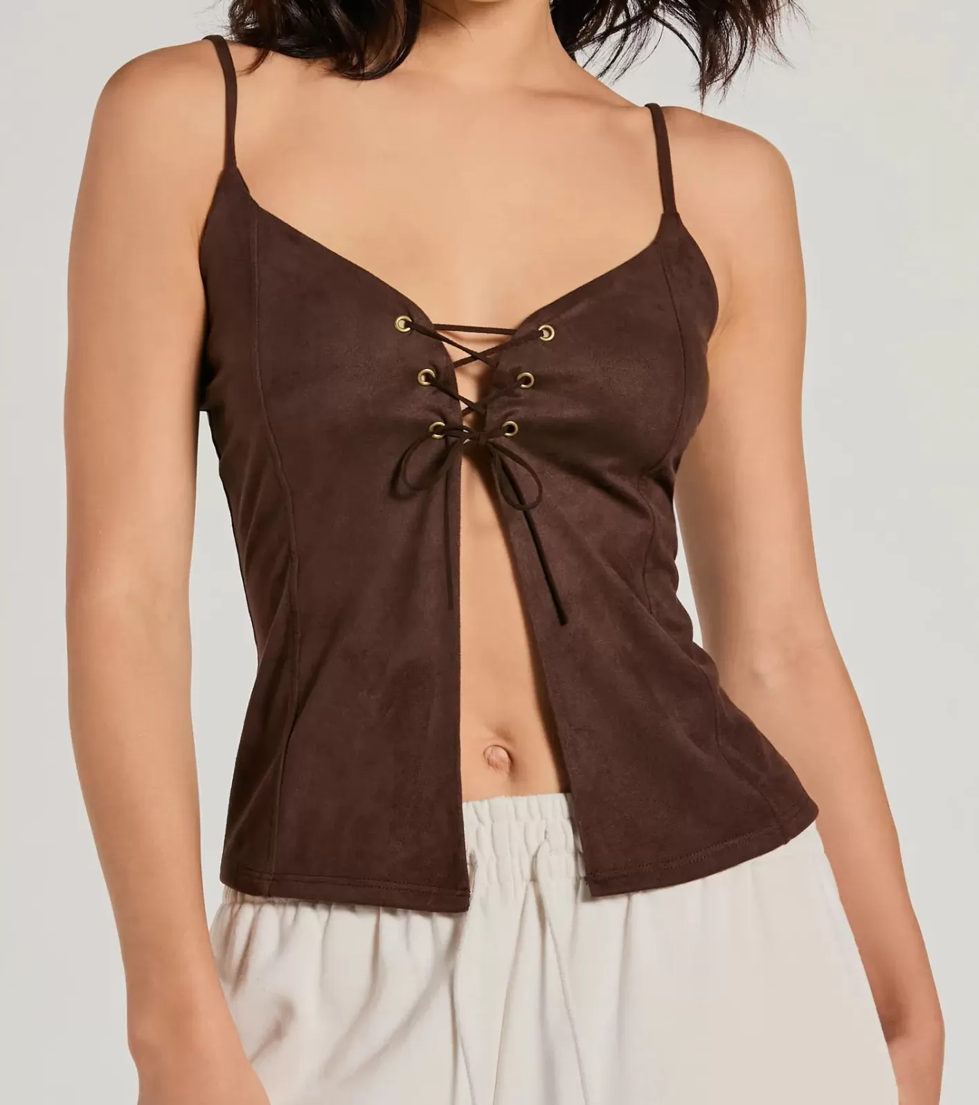 Everyone will be asking where you got this faux suede tank top! Rock this flirty crop top featuring a trendy lace-up front and center slit and a V-neckline adorned with spaghetti straps. Complete the look in high-waisted flare pants for a concert or summer fair!FitFeaturesFaux suede fabric lined with knit, minimal stretchV-NecklineSpaghetti strapsFront lace-up, center slitCropped lengthRuns true to size