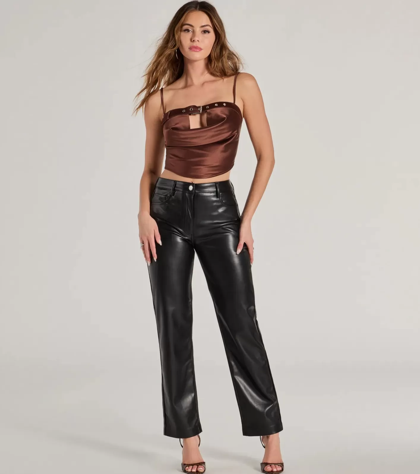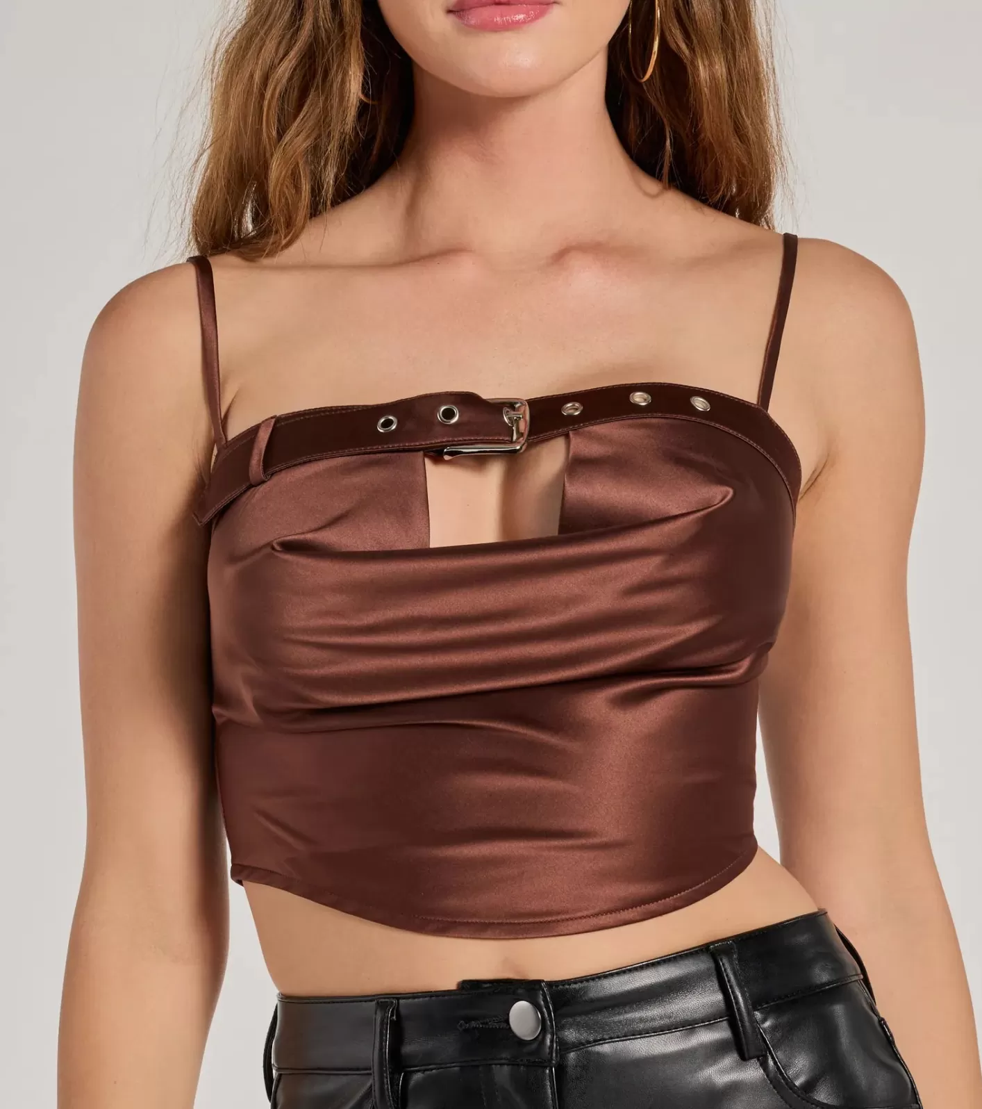 Level up the trend factor of your night out look in this satin crop top featuring a sleeveless cowl neckline with a sleek buckle trim, a sultry bust cutout, adjustable spaghetti straps for a customized fit, and an asymmetric cropped hem. Style with faux leather pants and mules!FitFeaturesSatin woven fabric, minimal stretchCowl neckline with buckle trimSquare-shaped bust cutoutAdjustable spaghetti strapsPartially smocked backFitted asymmetric cropped hemRuns true to size